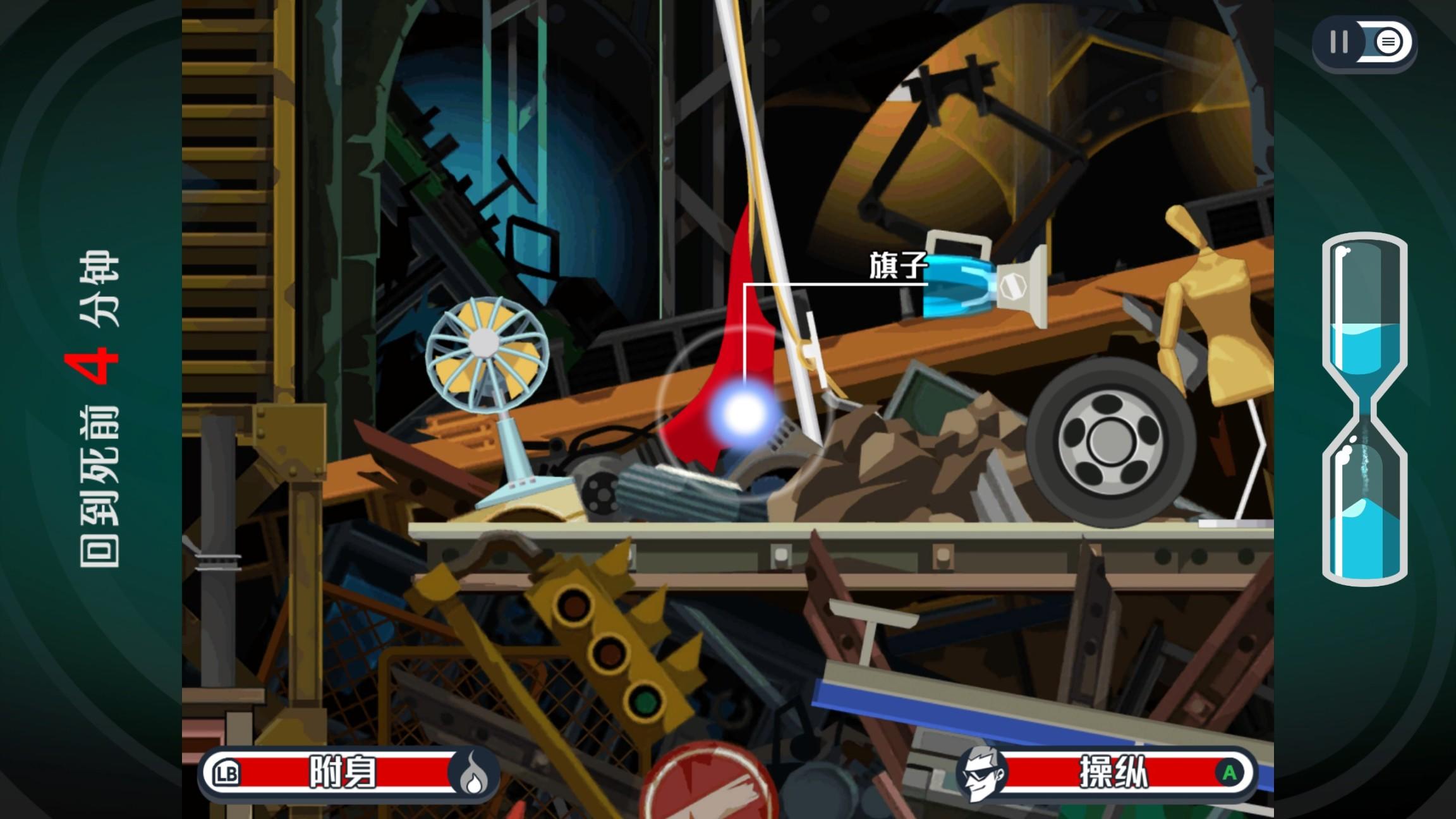 比方说,在这垃圾堆旁边里,你可以任意附体到冰箱、轮胎、旗子、风扇等方便自己移动,因为你的移动具有一定的长短距离限制,所以你便要发挥自己的聪明才智,以解谜的思路来灵活的让自己移动,并操纵物体,来改变这一切。