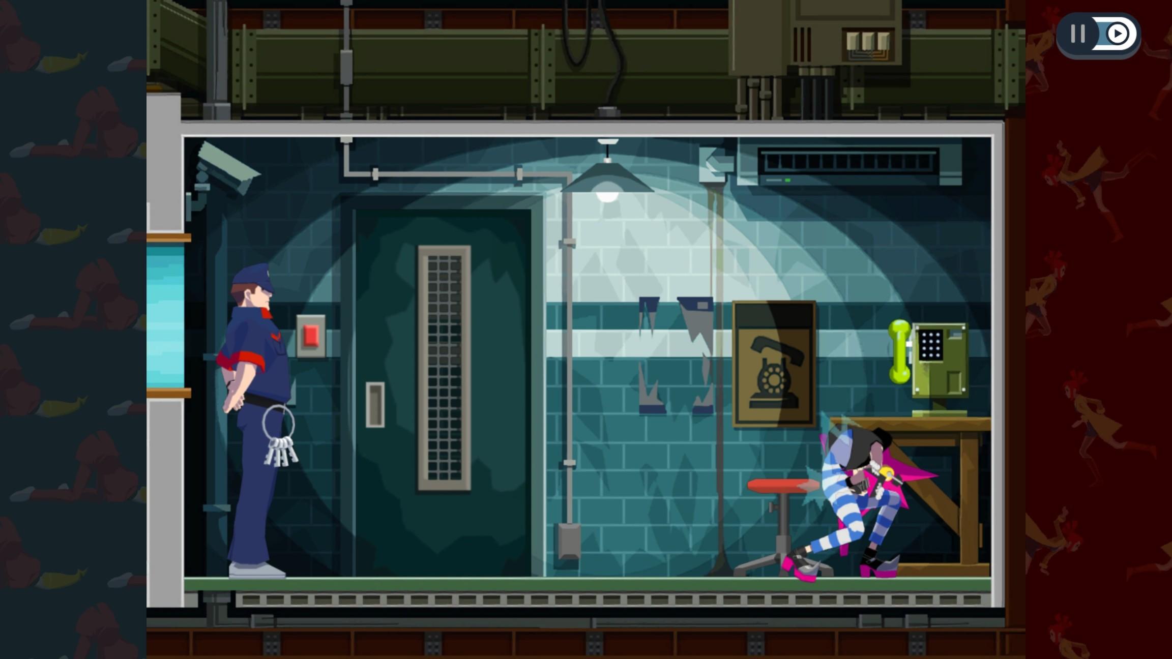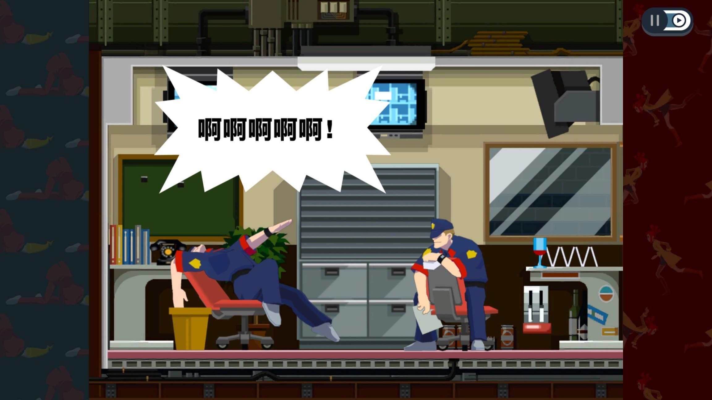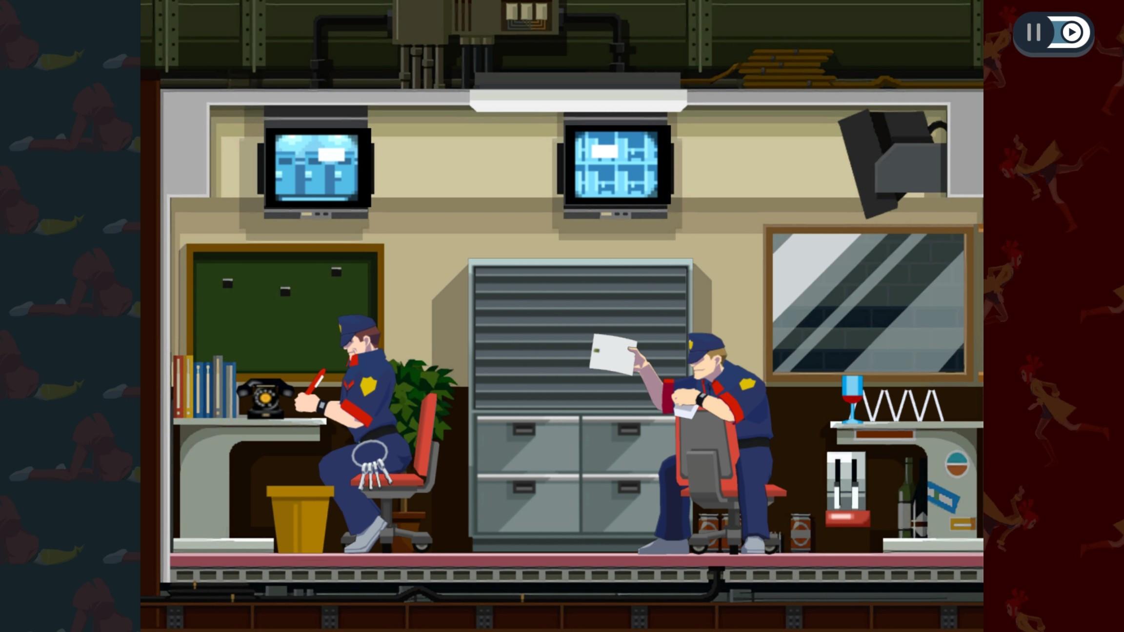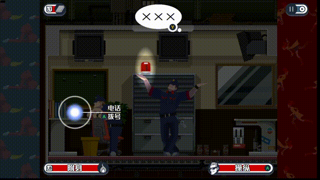 比方在保安室场景,我们通过「电话线」来到这里后,就会发现我们只能在左边这位保安大哥的范围中进行移动,虽然可以通过上面的监视器移动到右边,但奈何我们的主角可移动范围的尺寸是真的不够长。所以我们先观察这两位保安看看会拿起什么物品可以使我们正好附体到上面去。