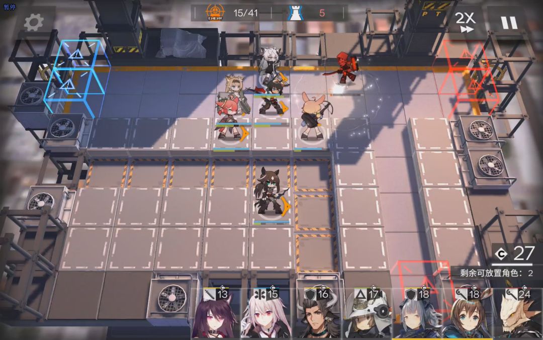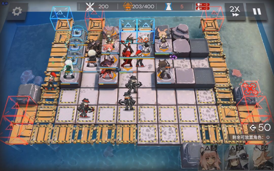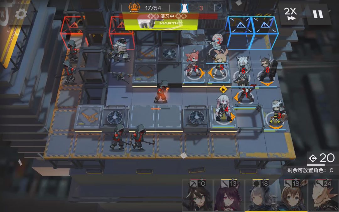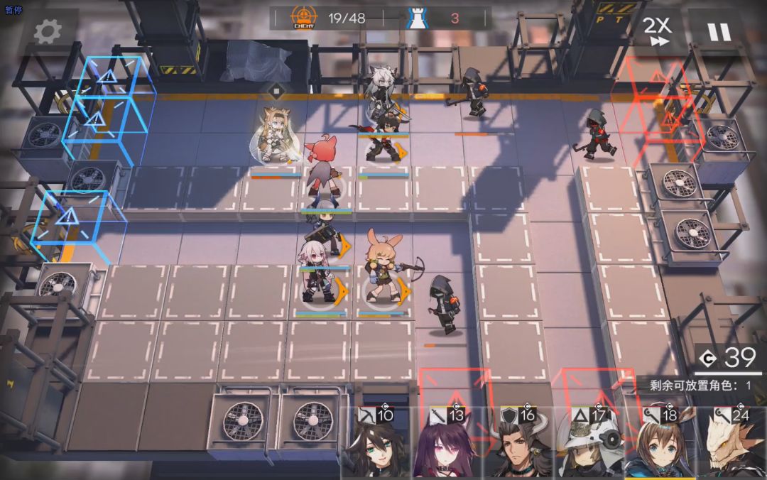 接下来就到2-10,boos关了。这是第一个难度跨度点。基本不使用助战的话,要卡很久。到这里,可以选择暂时缓一缓,提升一下干员了,速狙,盾,奶都可以考虑练一下。这里使用的是助战令通关的。