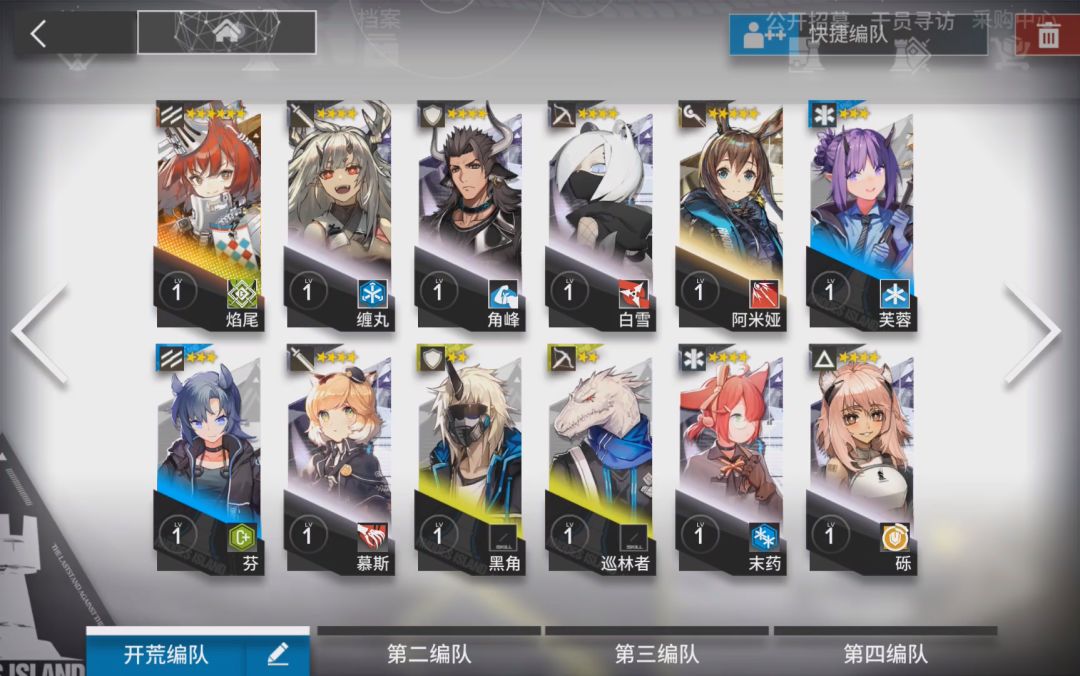 编队:方舟关卡是最多12名干员(不含助战)编队组成的小队来通关的塔防游戏。所以开荒编队就尤为关键了。并且也会体现木桶原理,干员需要均匀提升,但这一点在助战系统实装以及部分强力干员登场后就不同了,在前期,一个精二的干员可以单通大部分关卡,以此衍生出众多的单核作业。而助战系统规定,助战干员的等级限制为已有干员最高精英程度下的最高等级。就是你只需要有一个精二的角色,就能够借到一个精二满级的单核角色。借助找不是目的,只是帮你在最短的时间拿满活动奖励。不然,单凭自己,卡关卡你一个月都是简简单单的事情,方舟是高度依赖干员练度的游戏,萌新开荒能够获取的资源也极为有限。所以萌新在开荒期,因优先精二一个4星角色。其他干员只需要组成开荒过渡编队即可,非6星干员不要再精二了,非6星,编队组成要低不要高,即宁愿选3星不选5星(个别强力的4星可以选择)。因为他们培养需要的资源差距巨大。