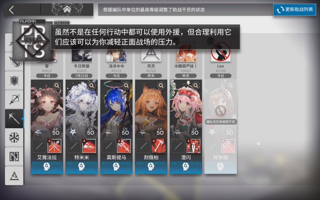 助战:推完tr-5,0-7时,会解锁助战系统。关于助战系统需要强调一点的是:新手保护期等级为20级,所以尽量在20级前把该加的大佬都加一加,把好友位加满,在20级后,助战位等级将和你自己的等级同步,助战位将优先展示好友,所以在20级之前尽量加好大佬的好友位。另外,加好友借助战的方式还有水论坛,以及好友搜索功能,需要哪位干员时,在搜索框输入该干员的名称会有很多大佬,申请,然后就等着大佬怜悯个好友位吧。