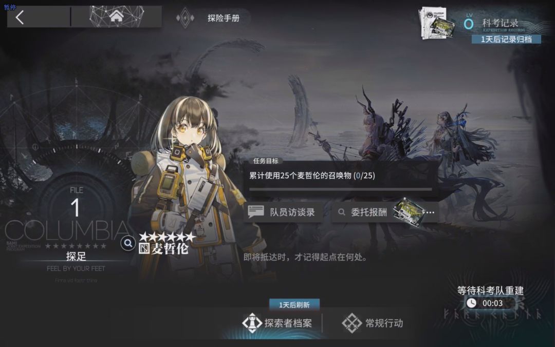 解锁月度任务后,就可完成任务了,需要注意,我们只需要完成目标,抵达第三层故土残区就可以直接退出放弃探索了,继续深入并不会获得额外奖励,只会浪费时间。水月肉鸽的月度任务同理,但稍微难一点,只有一位指定的满级干员,同样是抵达第三层,这里就需要我们自己再额外招募几个干员来帮助完成了,我们可以使用助战招募来招募一位满级的助战干员,就可以很较容易的完成任务了。