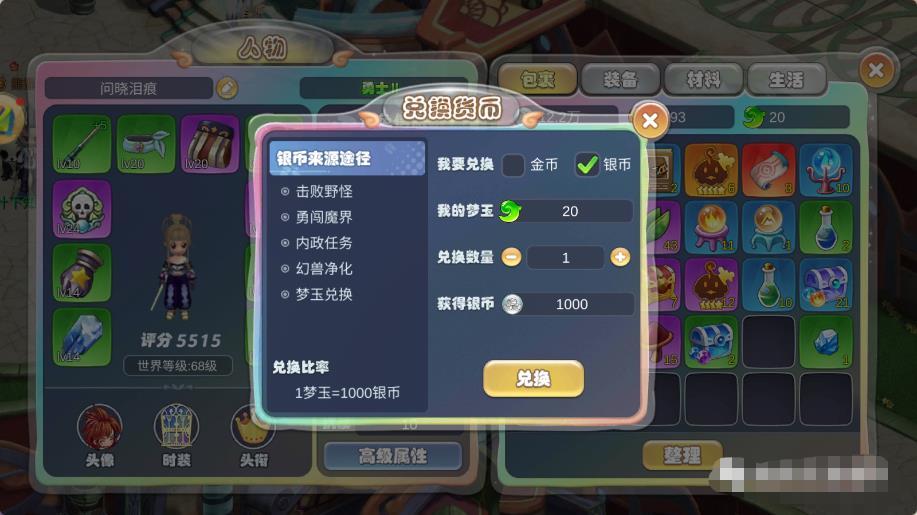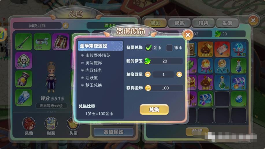 3、金币金币可以通过梦玉兑换获得,也可通过商会出售道具和活动任务获得。