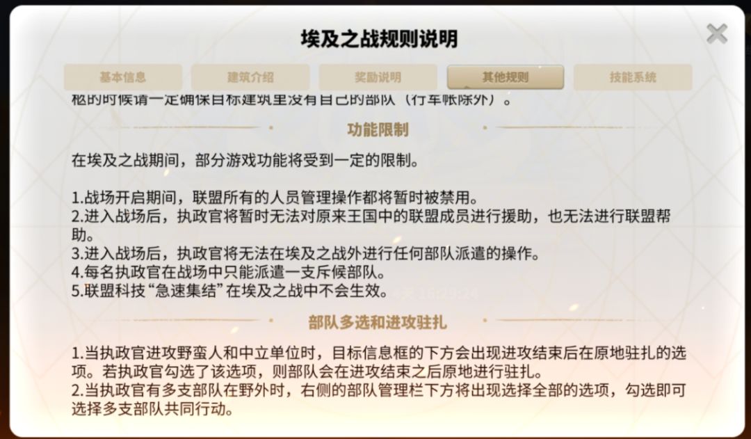 匹配规则:与联盟匹配分有关,匹配分一般是部队战力的两倍左右,车兵的匹配分会降低。与联盟胜负情况有关,连负多局的联盟将匹配到相对匹配分较低的联盟,相反,连胜多局的联盟将匹配到匹配分相对较高的联盟。