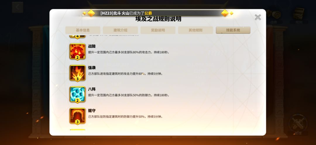 埃及技能也是对战局起非常大作用的一块,建议安排专人释放埃及技能(需要头衔R4)这个人建议是低战,只需要进集结,采集啥的,可以更方便观察全局,合理释放技能支援,各队也可以在联盟频道申请技能释放。 埃及技能释放需要消耗能量格,能量格只能通过时间推移慢慢攒,初始能量为零。