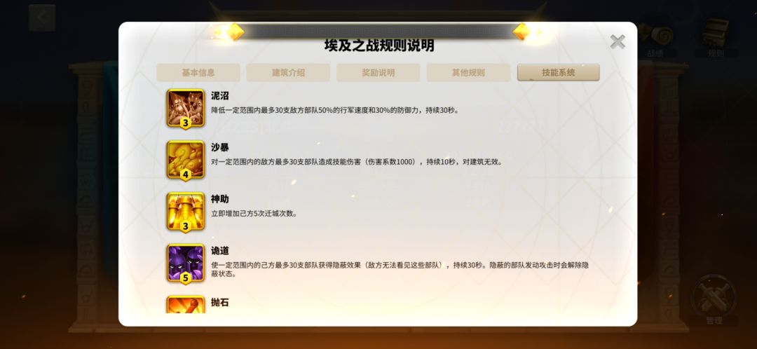 由于只能选取六个技能,所以如何选取重中之重,如果都是垃圾技能,那么埃及之战进行时将会陷入巨大劣势。