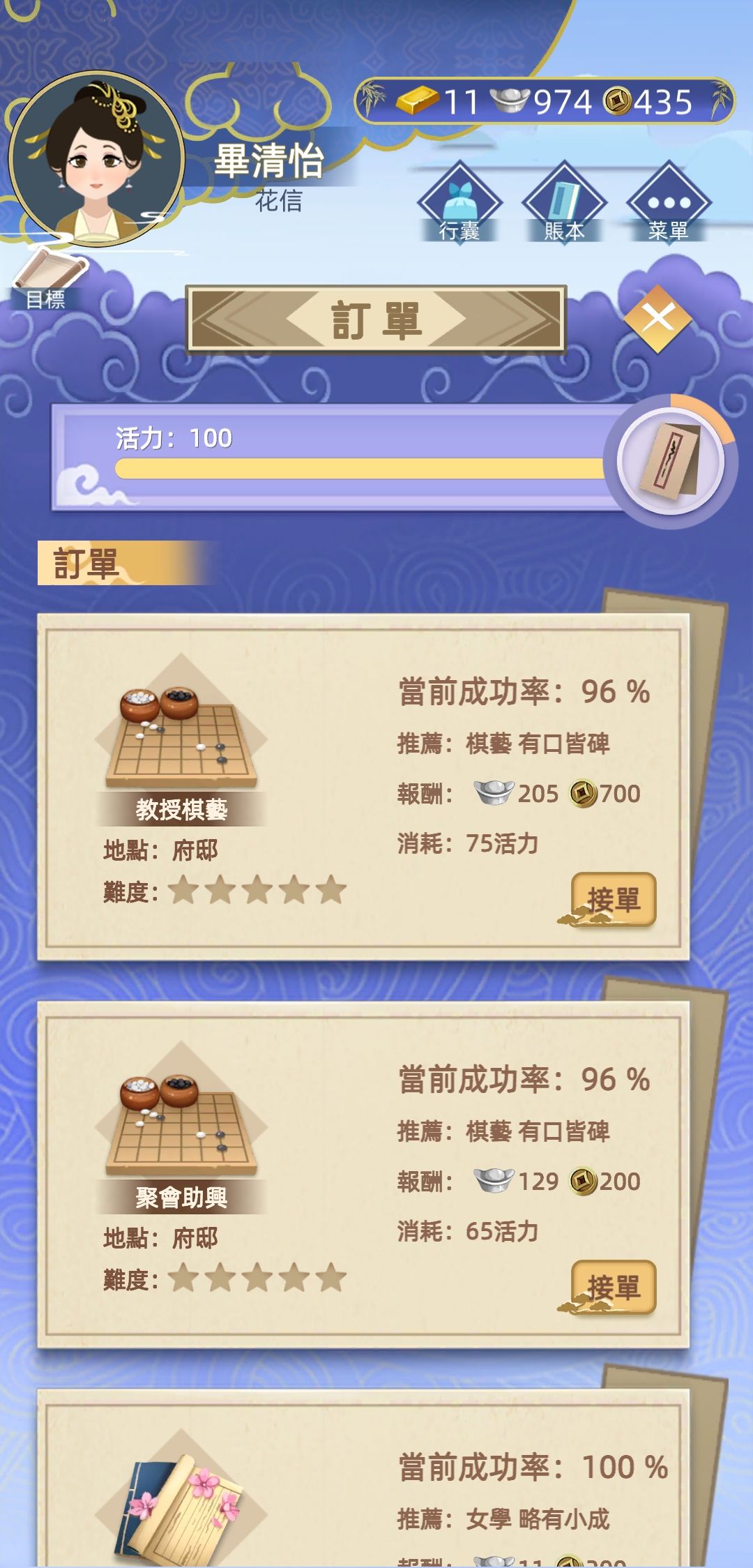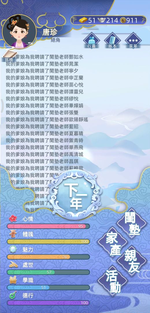 先选定要学那个方面,这次我选了女学,棋艺和理财,但因为太累了,最终目标只是棋艺。