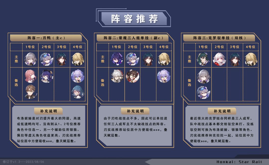 最近很火的克罗组合同样是三人成军,队中战技点基本都交给驭空来打。没练驭空则可换为布洛妮娅、银狼等角色。刃实战推荐和克拉拉一起,站位居中方便吸收aoe,叠天赋层数。