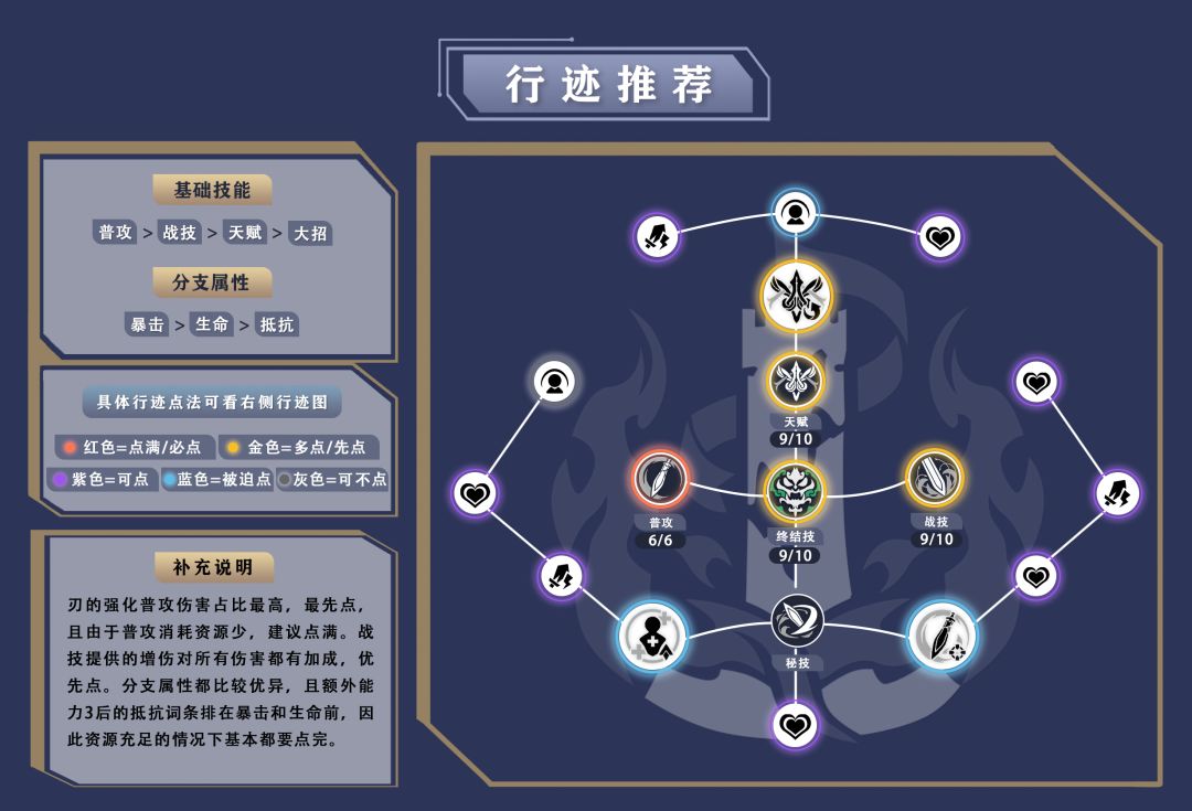 在进行行迹加点时,由于刃的强化普攻伤害占比最高,因此最先点,且由于普攻消耗资源少,建议点满;战技提供的增伤对所有伤害都有加成,优先点。