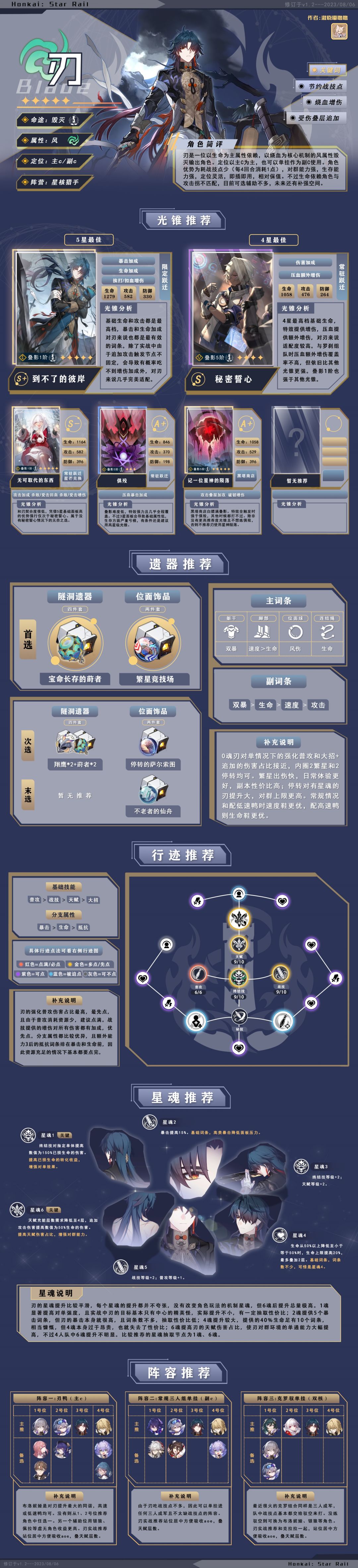 刃的配队思路比较灵活,可主C可副C。不过由于刃本身还是消耗了战技点,并不存在自给自足甚至产点的能力,因此目前环境下依旧更推荐主C定位。