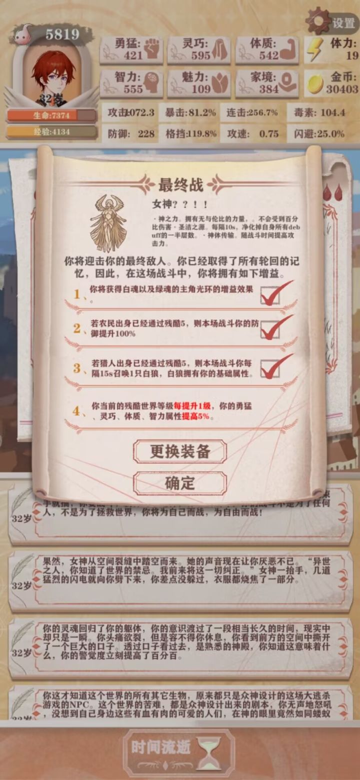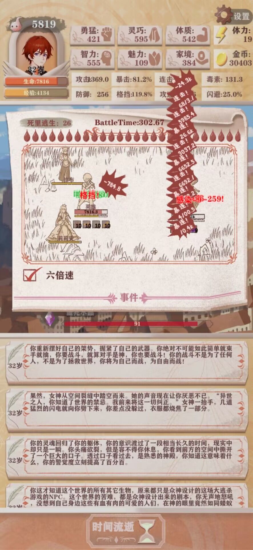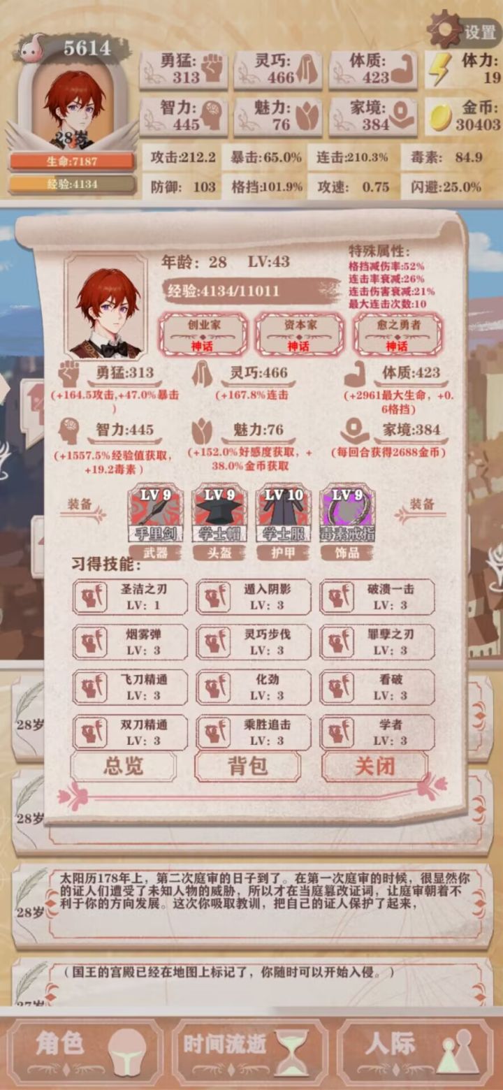 保持每回合银行取钱营销小麦,开森林后每回合摘松露营销,然后存钱,直到最后几年。后期开农民图后,每回合靠买田收割卖小麦和卖松露,稳定进账十几万(参考另一篇大佬的杀女神攻略)先刷智力,最后尽量刷满格挡、连击、暴击。