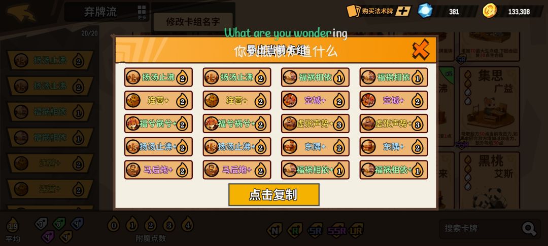 由于新版本有强化卡片的机制,使得我们可以组出一套完全的弃牌卡组,一旦启动就不可能断牌。这里up推荐卡组为下图
