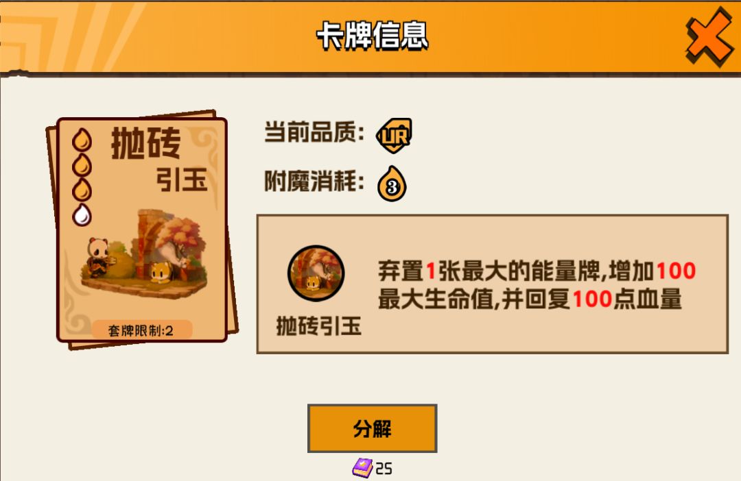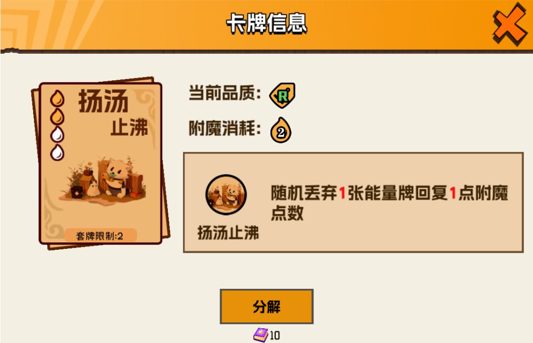 未雨绸缪可以使自己在下回合少摸能量卡时要弃置一张牌,启动有延迟,不过也不失为一张好用的卡牌。而星火则是0费附魔还能获得1附魔点,相当于稳过一牌还赚一点,不过有能力的小伙伴也能试试换成例如如意(ur)等能获得附魔点的牌。