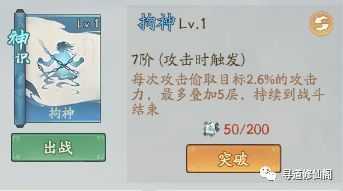 拘神(改版后):每次攻击偷取目标2.4%攻击力,每层最高不超过18%自身攻击力,最多叠加5层,持续到战斗结束;改版后每层最高不能超过自身18%的攻击力,换句话说偷取的攻击力不能超过自身攻击力18%*5=90%,假设我方攻击力50w,偷取的攻击力便不可以大于9w,因此本次改版当敌方攻击力是我方7倍或大于7倍的时候,拘神的效果加成会减少;