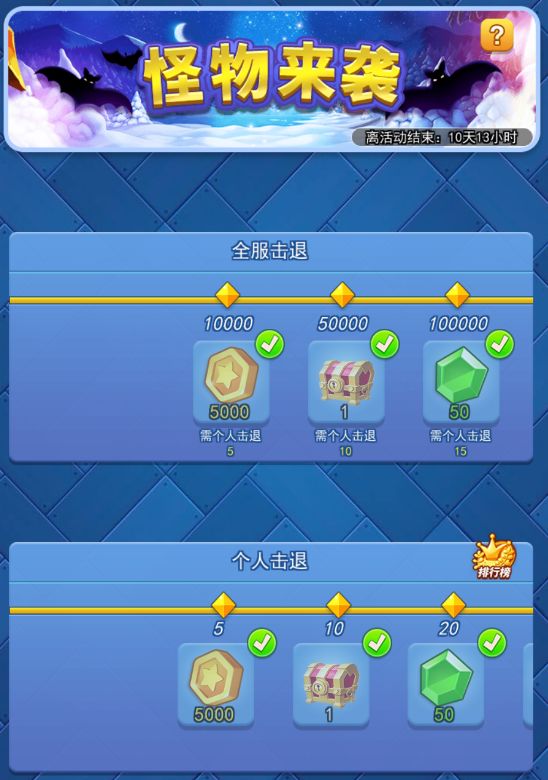 2.全服奖励的领取:需个人击退到达指定值且全服击退数量到达指定值