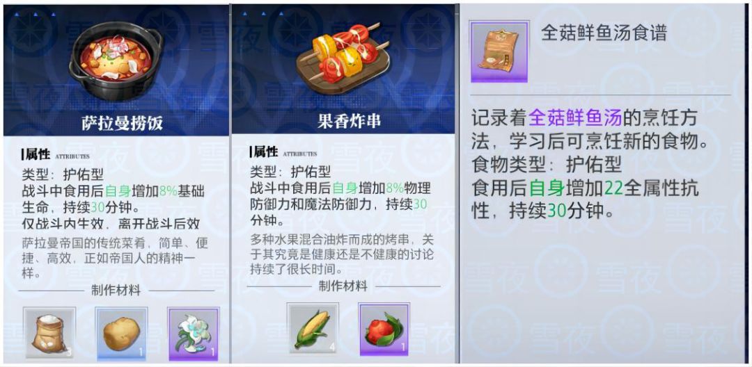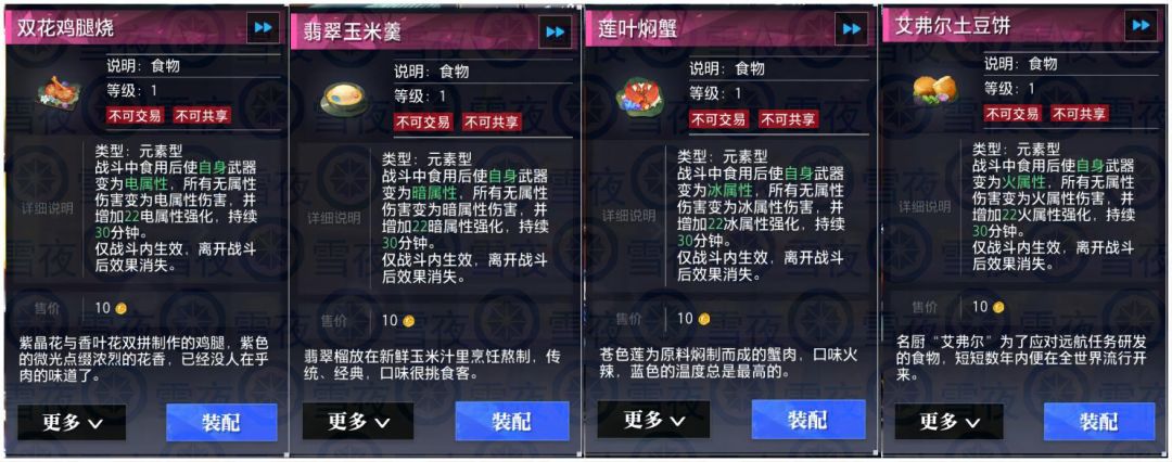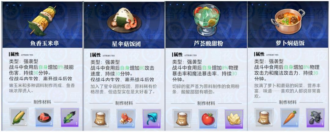 5.元素型:战斗内使用,只能生效一个,持续时间久,但脱离战斗后失效,即使你自带属性攻击,还是推荐食用,增加22属强,实打实的伤害提升,还有不加属强的,意义不大。