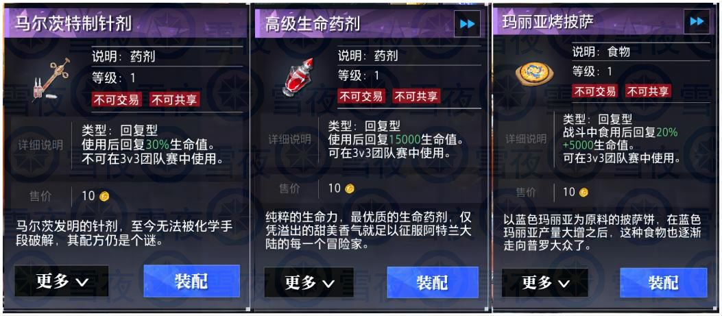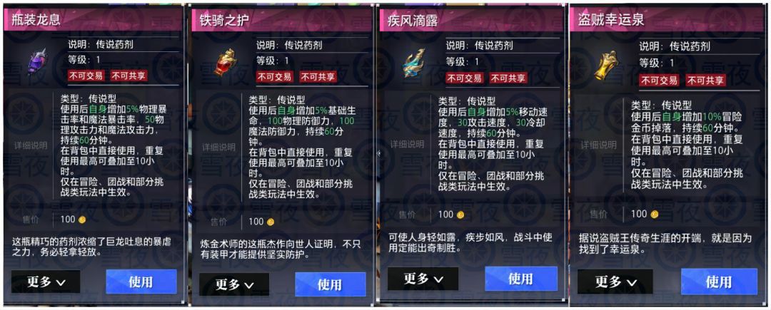 1.传说型:战斗外使用,持续时间不受是否退出战斗影响,可叠加,药剂之间互不冲突,获取方式目前只有活动能获取,无法自行制作。