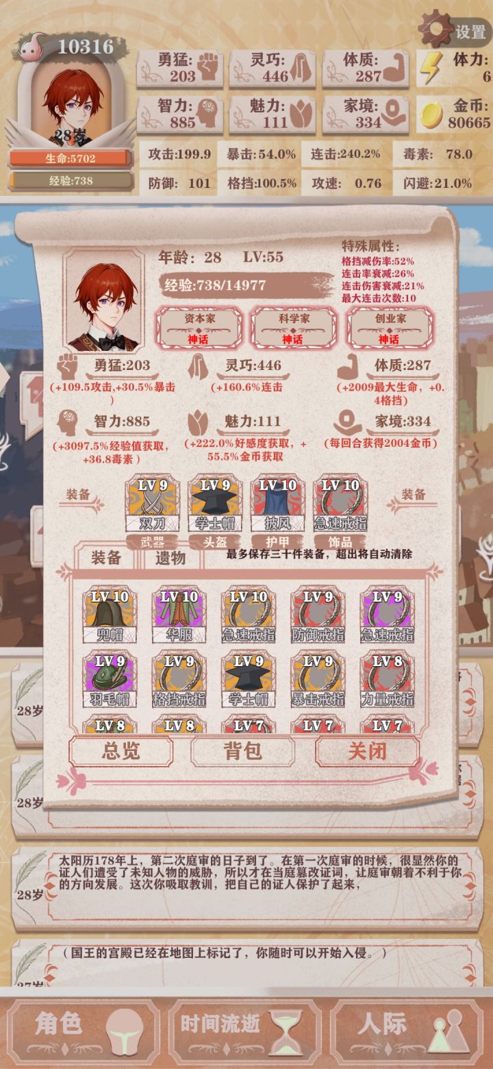 推荐每回合看两次书(不停,除非恶兆四后跑商体力不够),15岁开始去商业街开放加家境,用来营销后全存银行,下一回合后取出用来营销,营销完后再存,循环反复(家境到200后可以停止存银行,资本家到300后可以停,如果想营销更赚钱的话推荐一直不停)。保证跑商基础上多余的钱买智力,最好买到正好商业街每10点智力多1点家境的临界值。森林图解锁后、商业街停止加家境后,用这40体力捡松露(新版本为鹿皮或檀木)。之后智猛(一刀流主勇猛)或智巧(连击流主灵巧)对半买。
