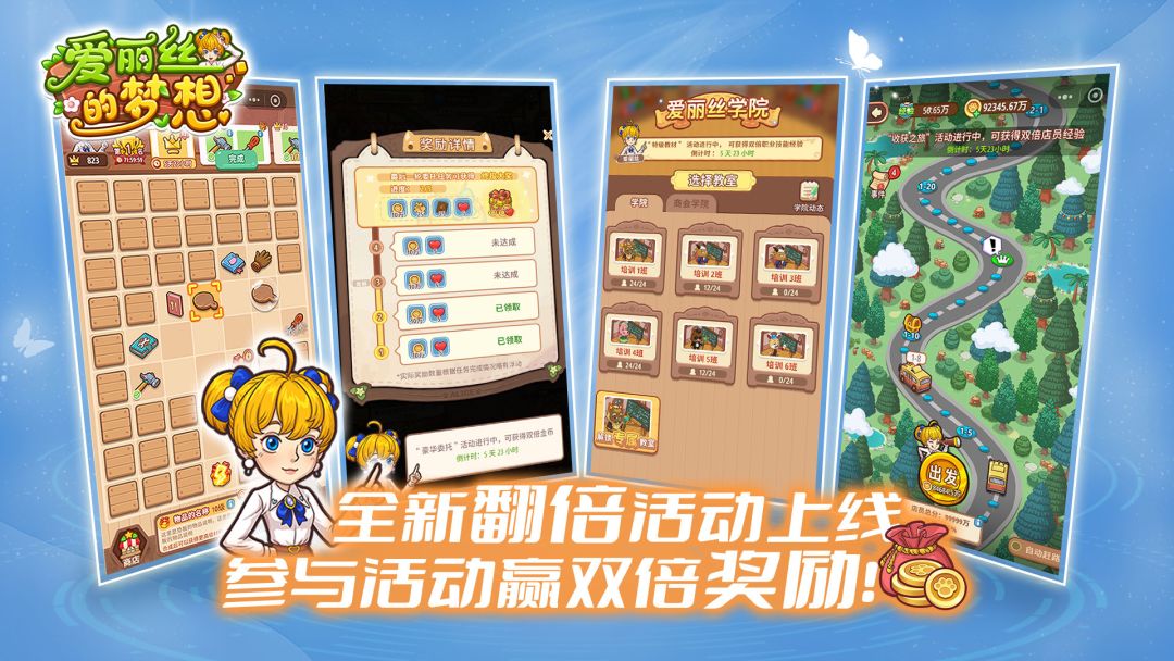 全新翻倍活动上线了。在翻倍活动期间完成游戏可以获得双倍奖励哦。“订单达人”活动期间完成订单可以获得双倍的知名度;“豪华委托”活动期间完成委托可获得双倍的金币。更有爱丽丝学院双倍职业经验活动“特级教材”和历练玩法双倍经验活动“收获之旅”。