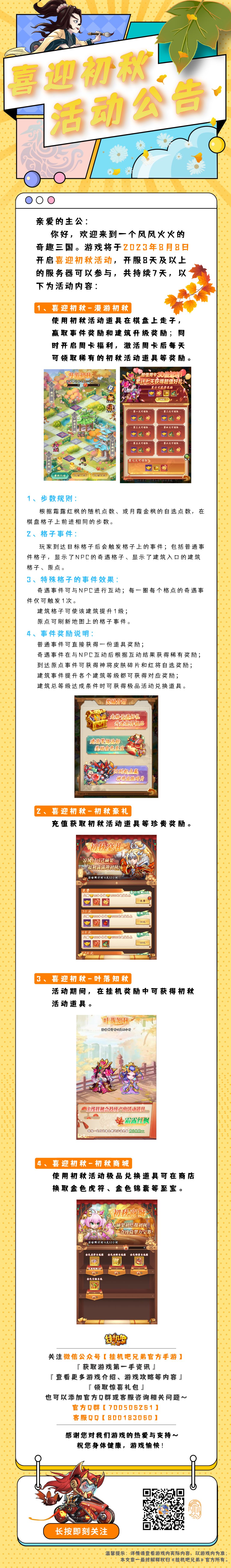 你好,欢迎来到一个风风火火的奇趣三国。游戏将于2023年8月8日开启喜迎初秋活动,开服8天及以上的服务器可以参与,共持续7天,以下为具体活动内容: