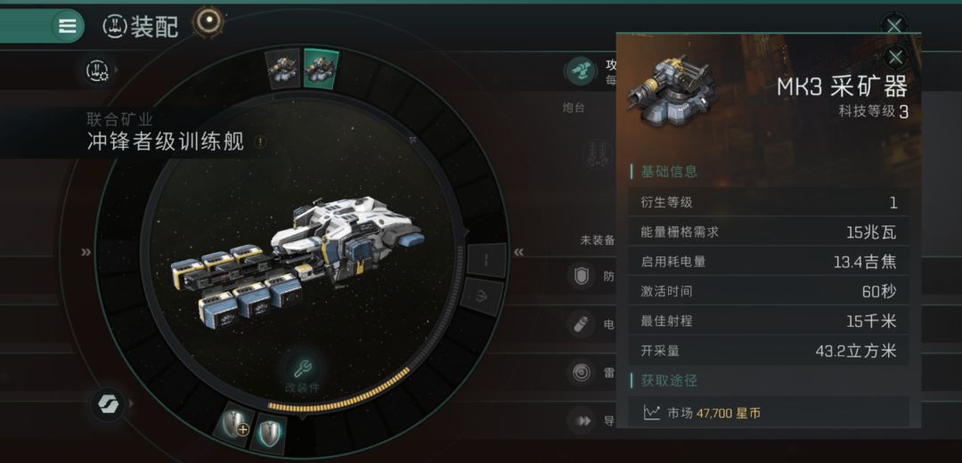 船是新手任务送的冲锋者训练舰,采矿器是mk3,采矿技能4级,都是默认版本。