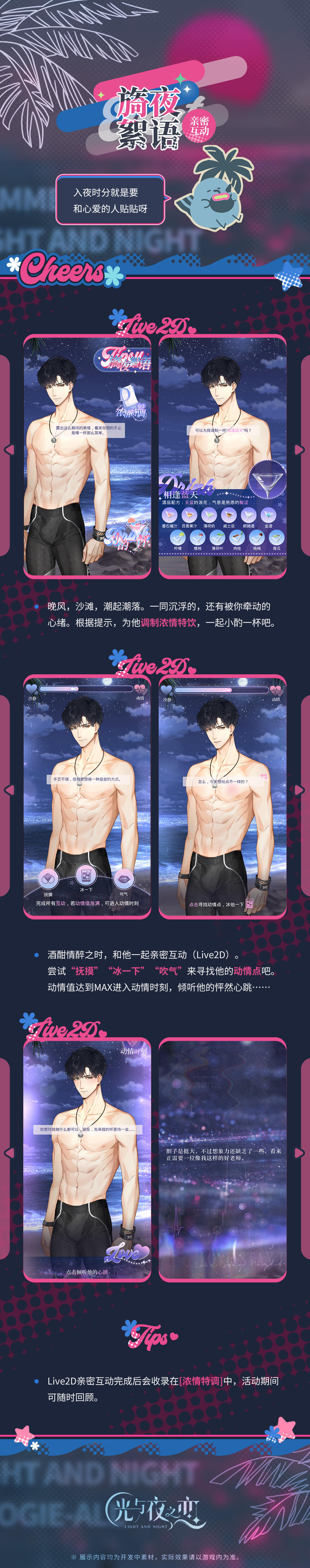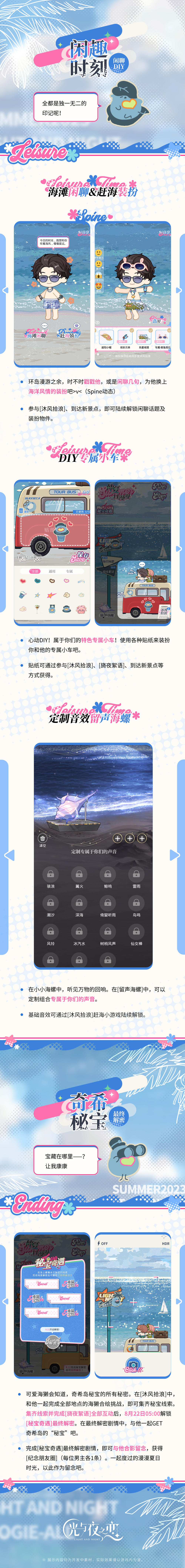 活动概要:夏日漫漫,纵情热恋——参与活动「仲夏日漫漫」即可体验限时活动剧情,与他一同沉浮在海岛夏日的热浪中,还可获取限定抽卡道具、活动限定灵犀、纪念朋友圈、专属头像/称号/头像框等丰富奖励。