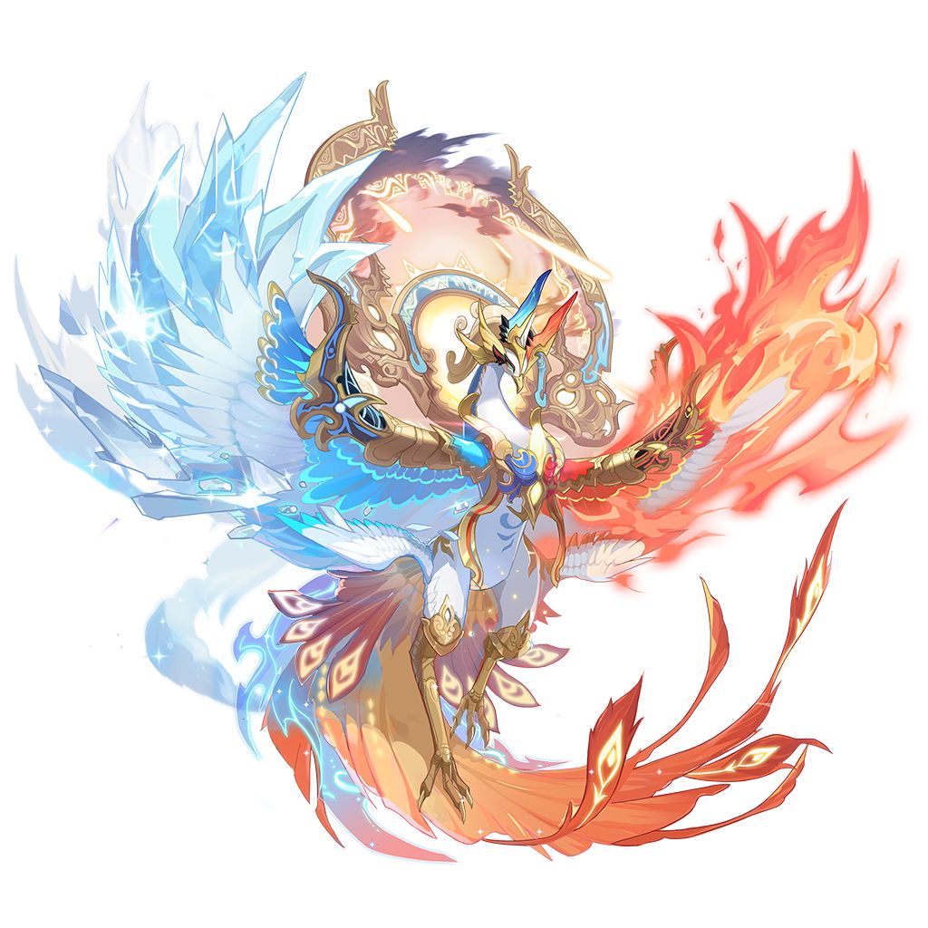 每次上场提高自身40%物理抵抗和魔法抵抗,不可叠加;受到致命伤害后,回复所有体力值,变成凤凰蛋,无法行动且提升伤害抗性80%,受到伤害令目标害怕;1回合后若未阵亡,则自身行动时变为炽寒天凤并全属性提升2级和触发技能凤灵化身的持续效果,该效果只能触发1次