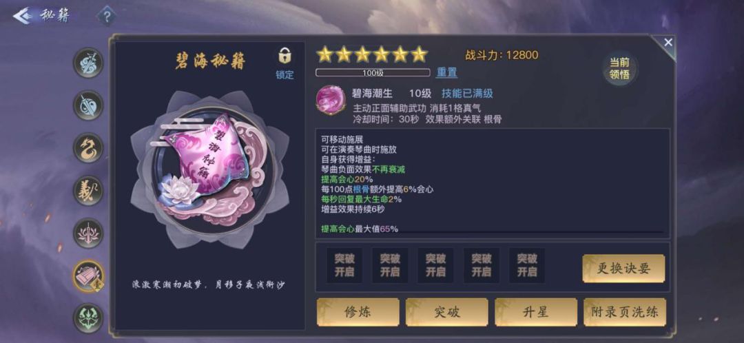 登峰造极:登峰造极前面阶段的秘籍都是暂时过度使用,登峰造极之后可以获得峨眉虞弦专属的超强秘籍,碧海秘籍,附带碧海潮生技能,可以移动施展,可在演奏琴曲时释放,释放后增加会心,琴曲负面效果不再衰减,每秒回复最大生命百分比的血量,根骨值还会额外增加这些技能效果,特殊招式还会增加内功攻击。超强的技能,专为虞弦而准备,可以弥补虞弦流派释放技能时的缺点,释放时间过长,控制效果衰减,这本秘籍可以给虞弦带来很高的提升效果。