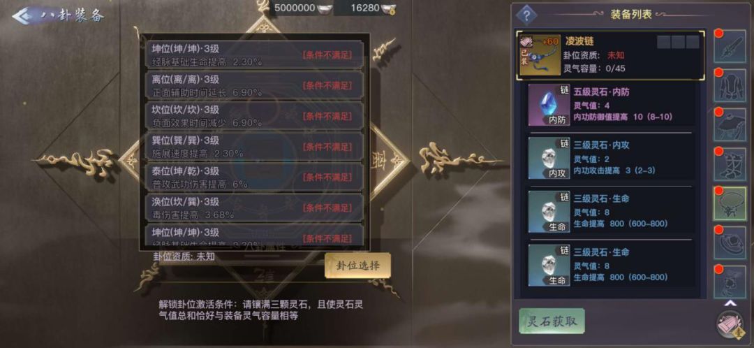 项链、戒指、玉佩卦位推荐造成伤害提高的乾位,施展速度提高的巽位。