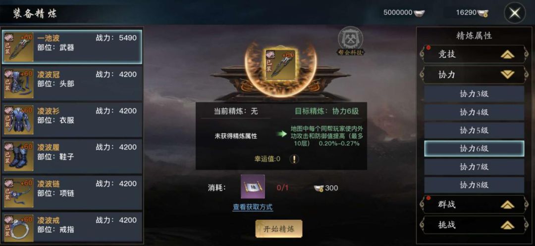 装备精炼方面,游戏前中期以PVE玩法为主,为了更好的挑战各种副本和风云榜玩法,建议还是暂时精炼挑战属性,增加对怪物的伤害。游戏后期可以将精炼全部更换成竞技属性,增加对玩家的伤害,喜欢打群战的玩家也可以选择群战和协力精炼、减伤,增加攻防。主要的选择依据是根据个人需求来定。