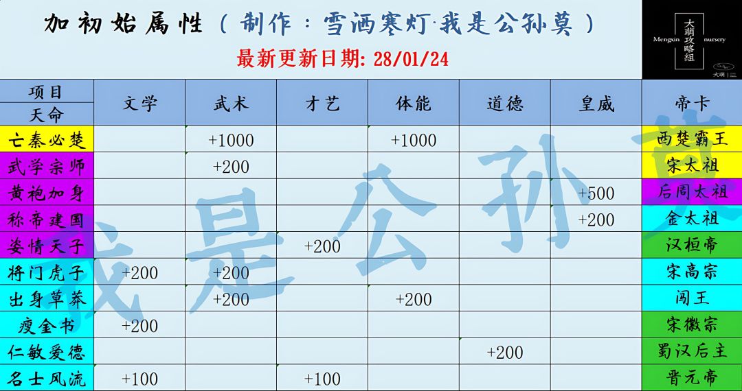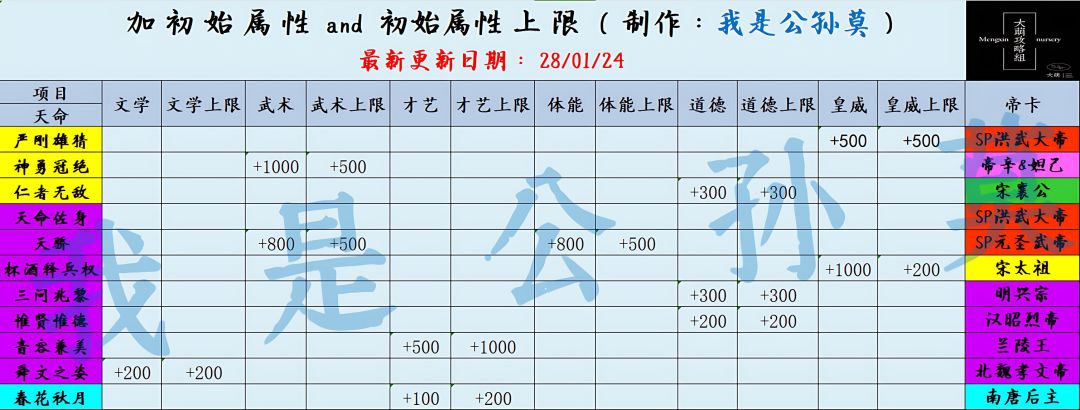 【整理】加初始皇帝属性 and 属性上限的天命一览