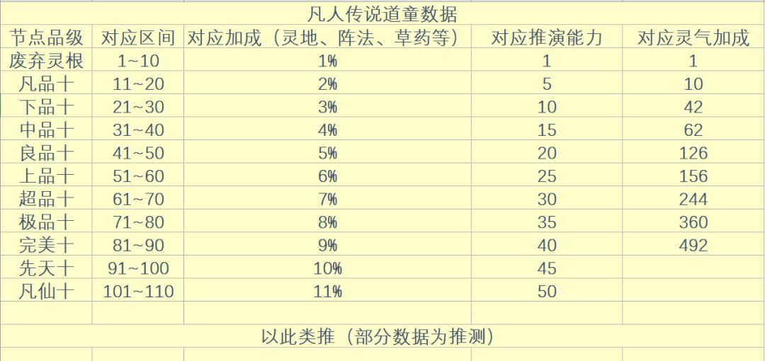 而推演能力和灵气加成主要遵循等级越高,加成越高的形式。根据数据观察,其中推演能力大致每两三级为一个新的推演数值,灵气加成则为不同品级的一阶作为基数,按对应数值进行提升(如下中良上的提升就是基数按2345进行累加)。在考虑灵气加成的情况下,良品一的收益是优于中品十的。