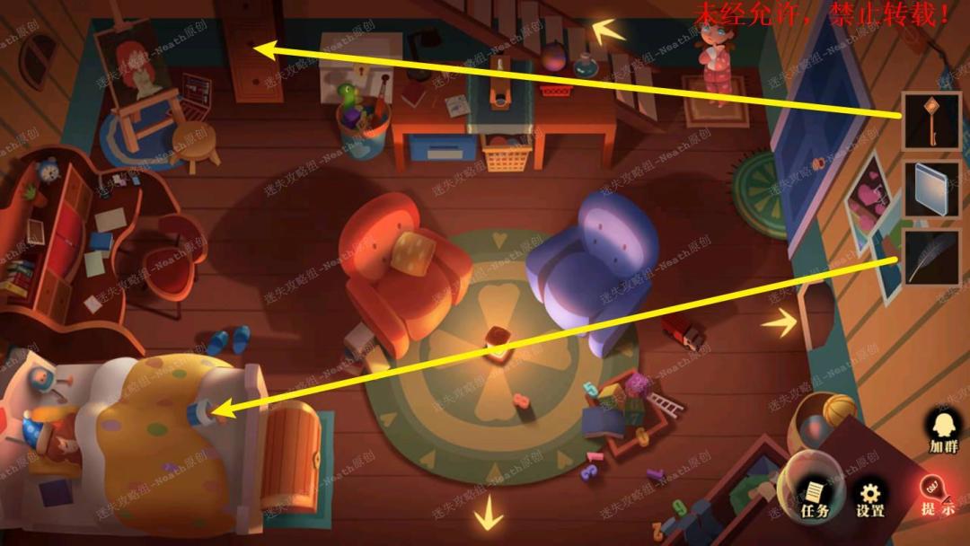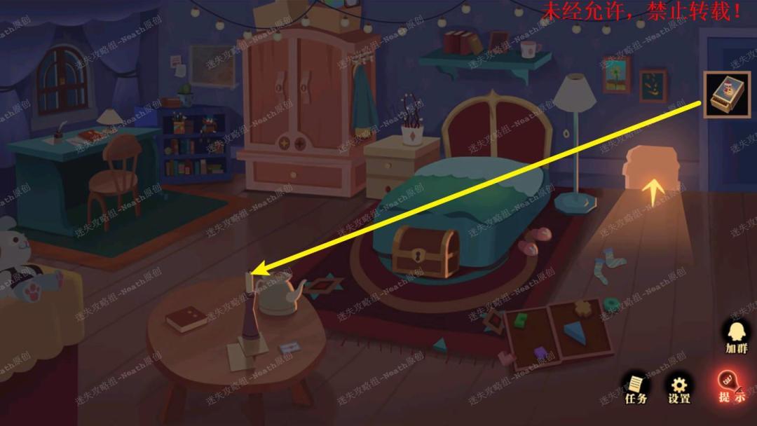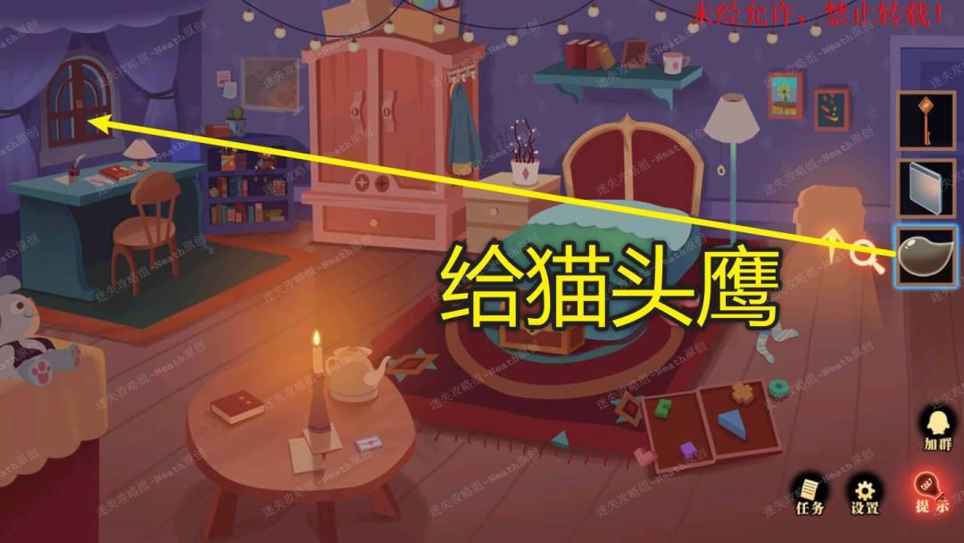 21、到自己的房间,把【气泡】给猫头鹰,拔走【乌鸦的羽毛】。21