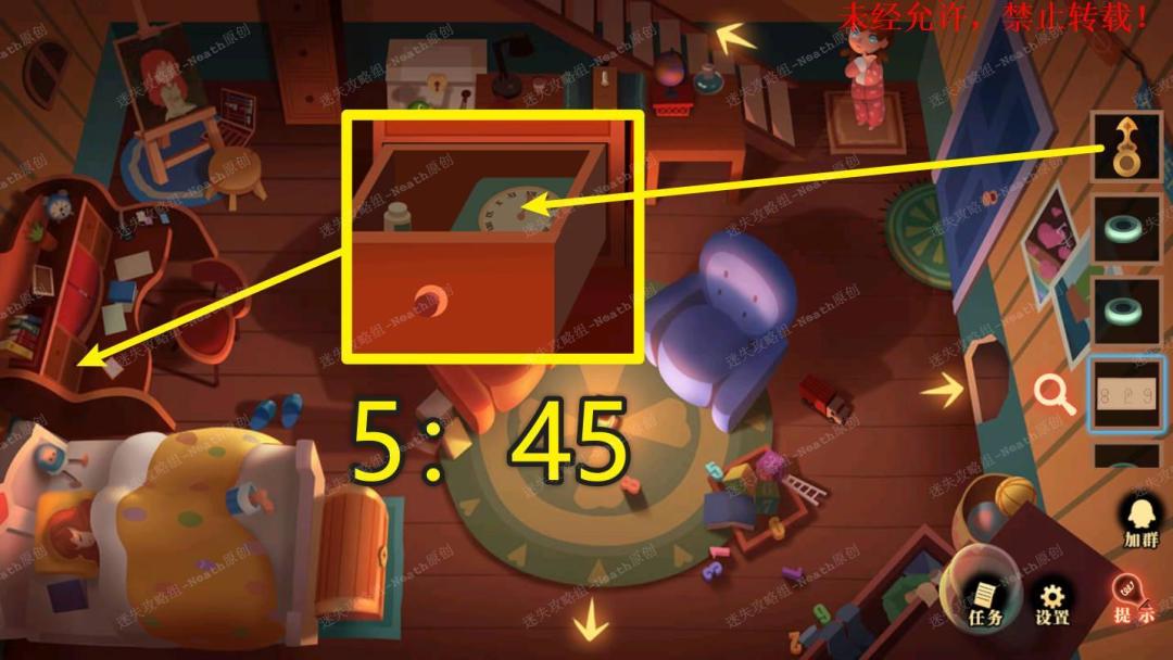 16、点击左边的桌子,点击左下角抽屉,把【时针】安装到钟表上,调整时间为5:45,拿走【胶片】。16