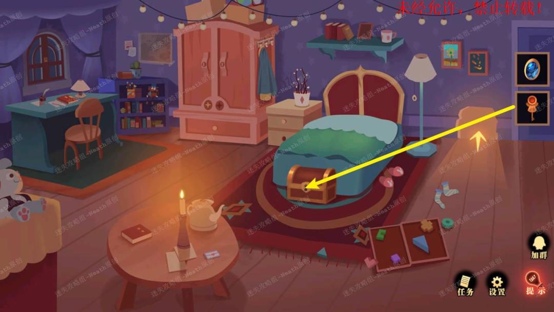 26、到自己房间,使用【圆孔钥匙】打开床尾的箱子拿走【红宝石】。26