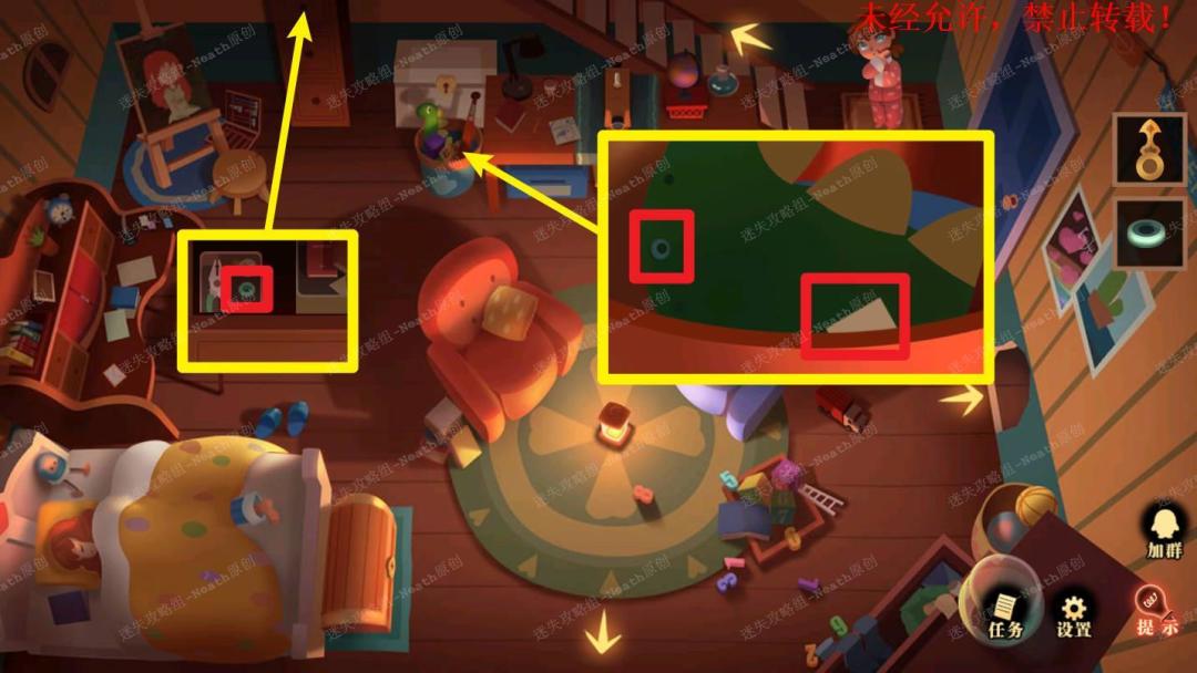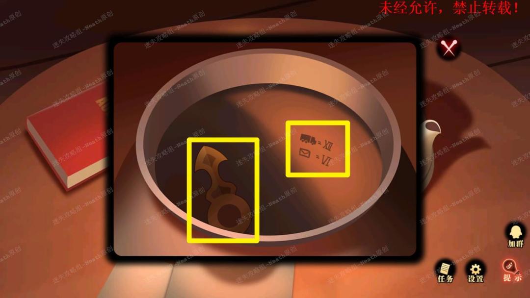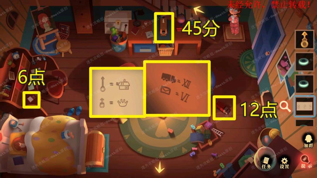 15、进入姐姐房间,根据壶壁上的线索,得知“卡车”代表XII(12),“信封”代表VI(6),所以卡车和信封分别代表12点钟和6点钟,再根据日记本里的线索,投影仪方位为分针时间,也就是45分,王冠方位为时针时间,也就是5点(王冠的位置:点击下键,观察壁画上的王冠,和箱子位置一致,结合大场景里的箱子位置可以得知是5点)。15 15.1