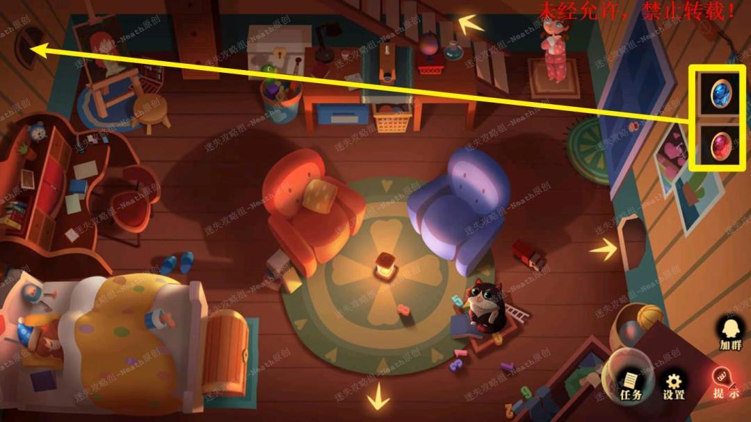 22、到姐姐房间,使用【黄铜钥匙】打开第二层抽屉拿走【色卡】,使用【乌鸦的羽毛】给姐姐挠痒,在被踢出的猫咪身上拿走【蓝宝石】。22
