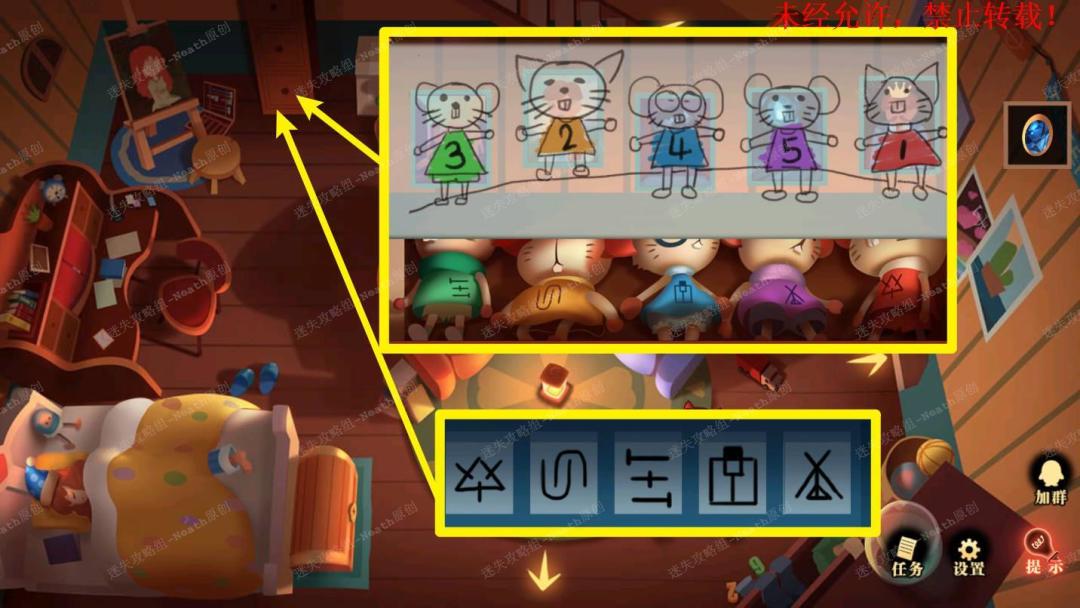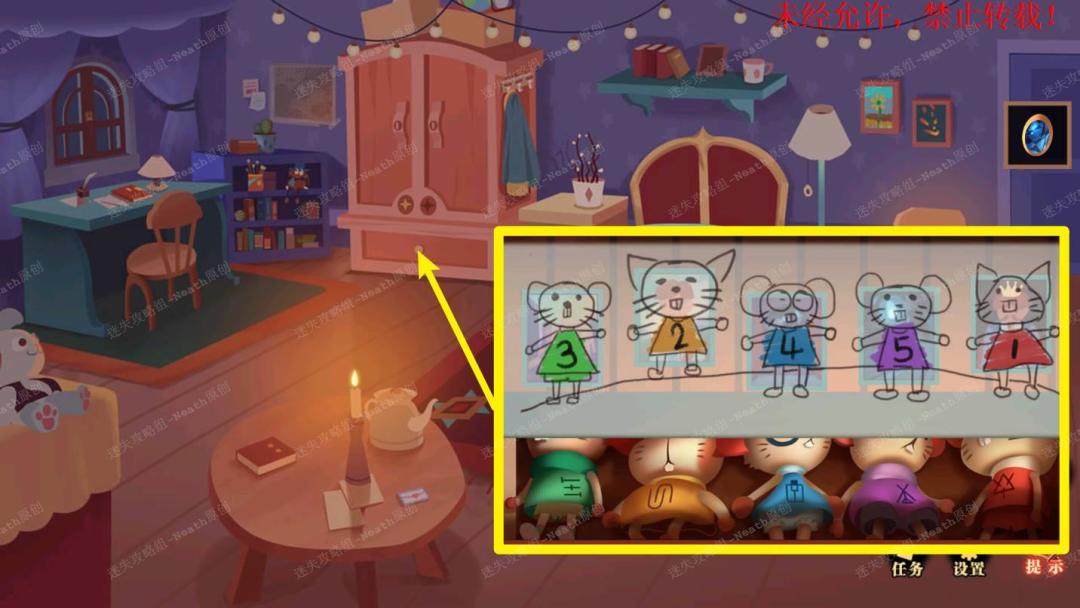 24、到自己房间,打开衣柜最下层抽屉,可以看到五个不同娃娃和对应的符号,结合壁画上的数字和颜色可以得到一组密码。24