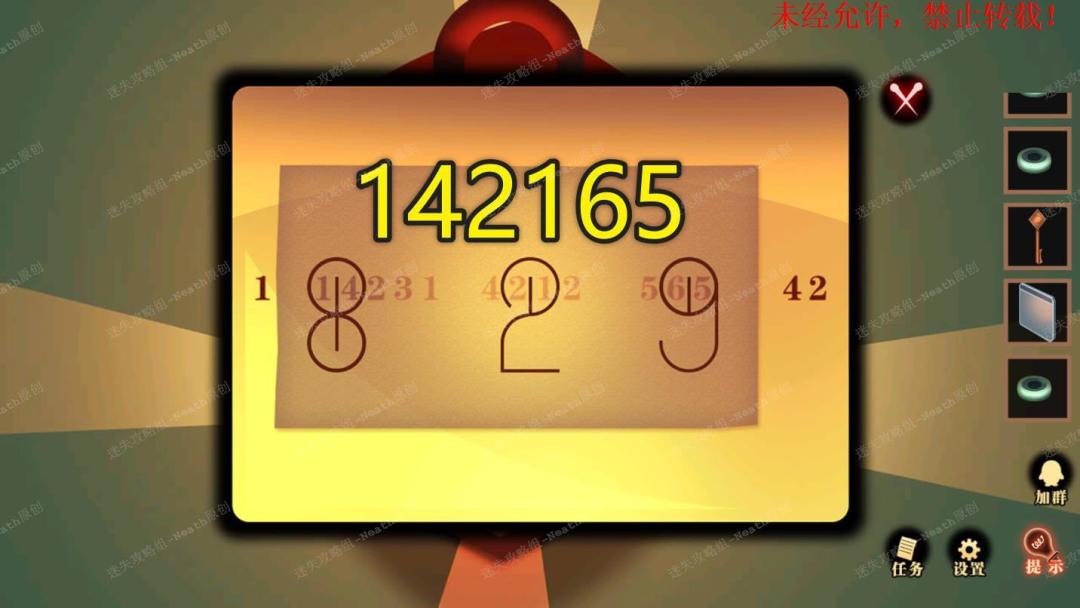 18、点击地毯上的灯,点击右上角红字,拖动【撕下的纸片】到红字上,调整竖线位置使“圆圈”能框住两个数字,得到一组数组142165。18 18.1