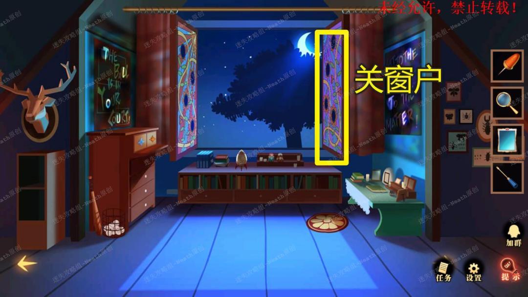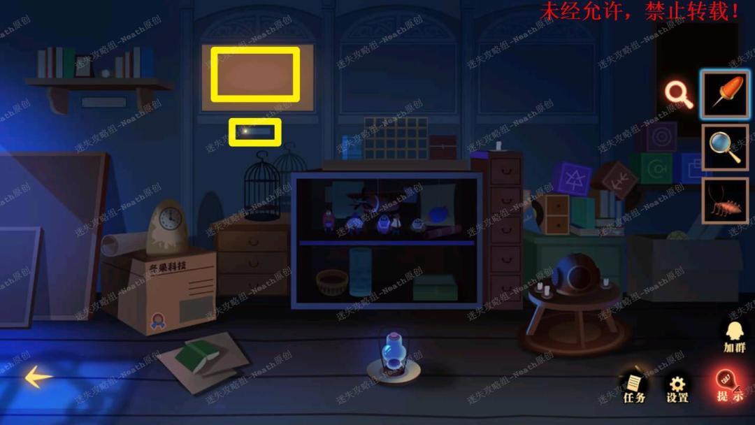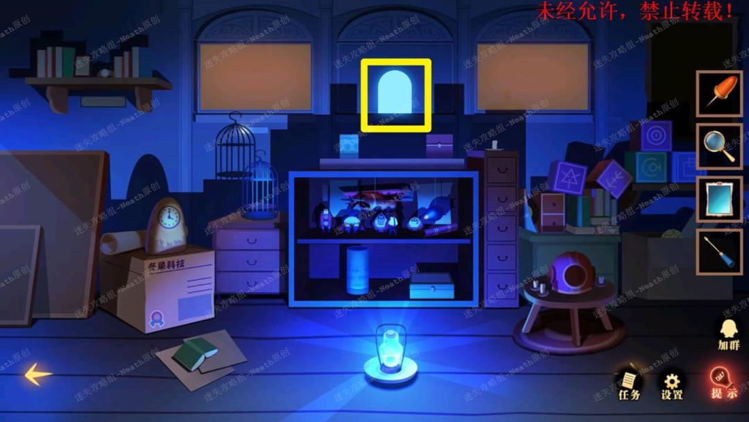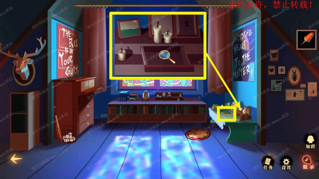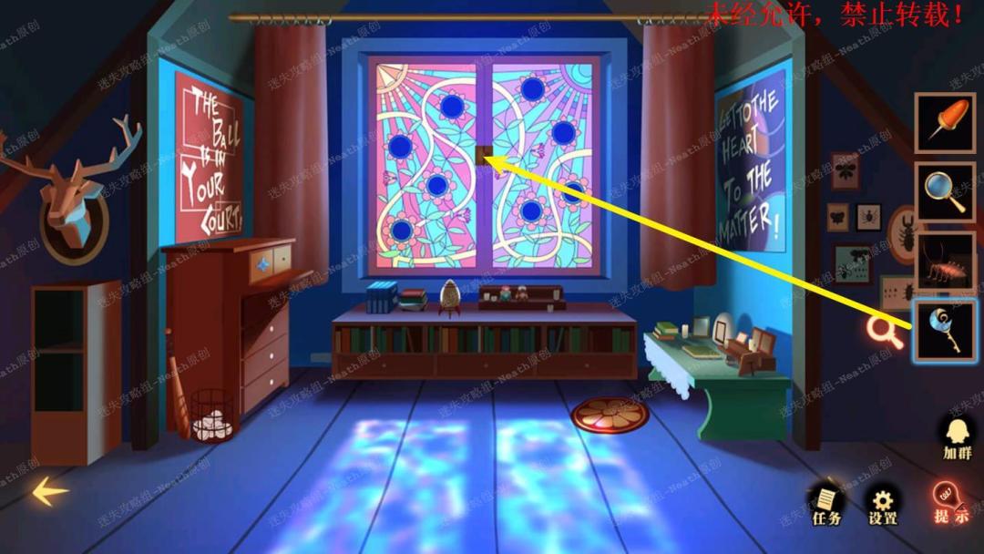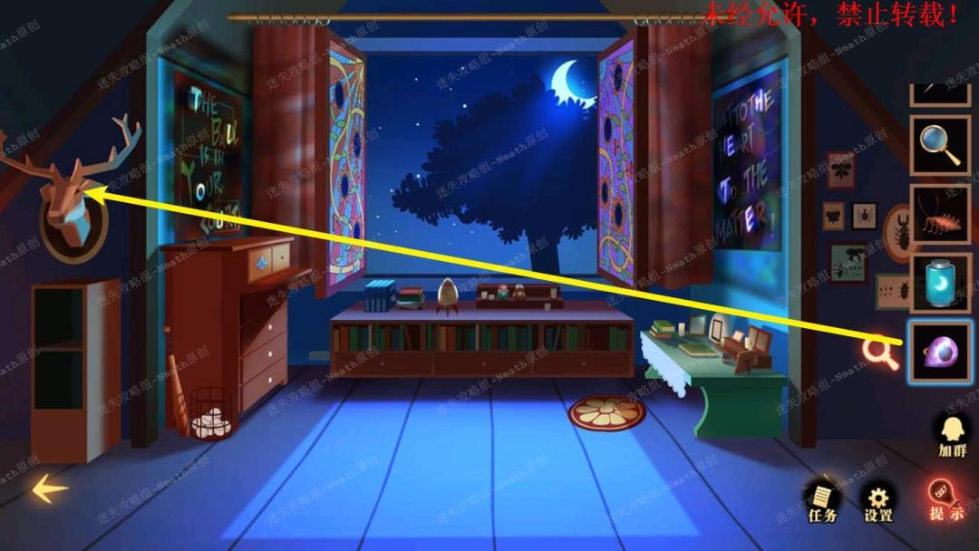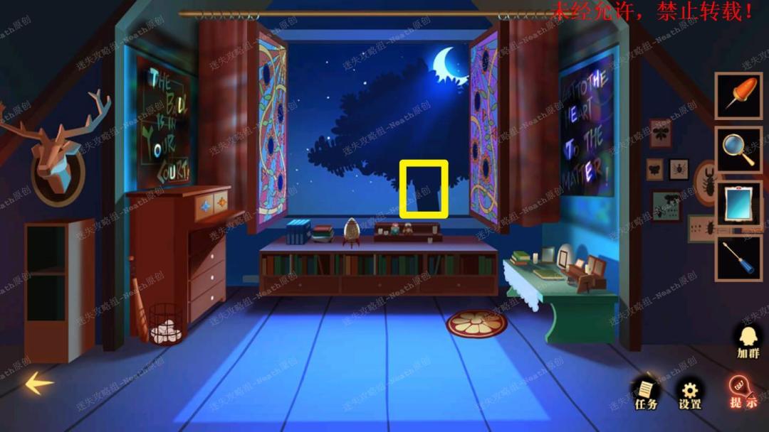 51、到杂物间,点击右边发光窗口,给树上的尺子替换成【刻度卡片】,点击发光的小门,在里面拿走【马蹄徽章】。51 51.1