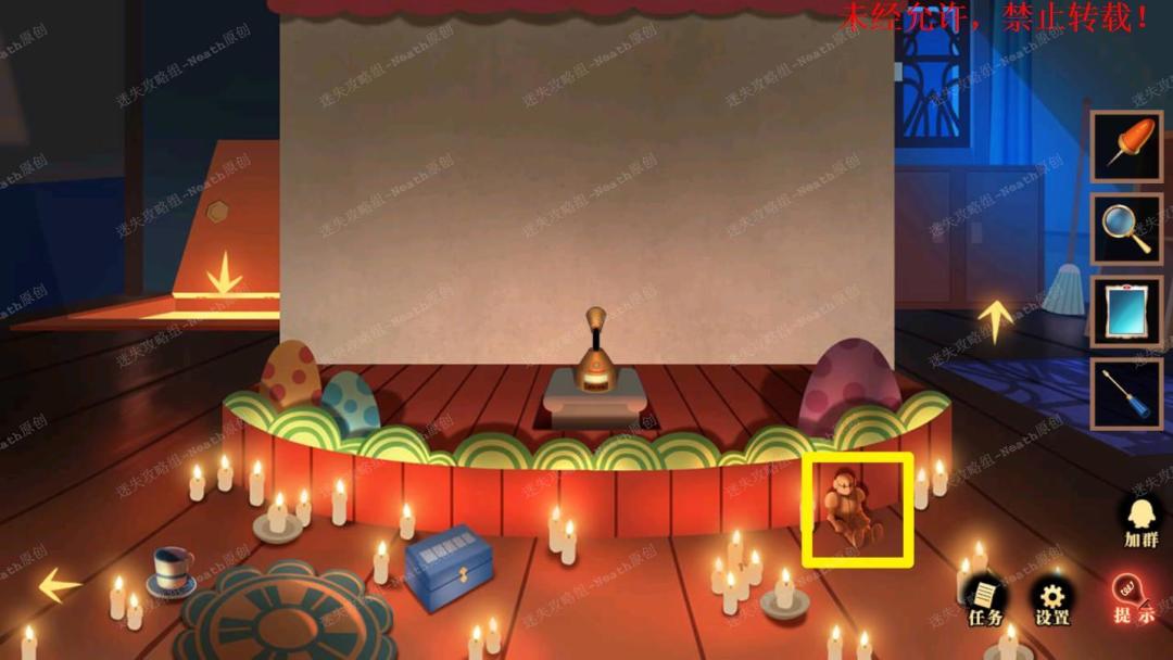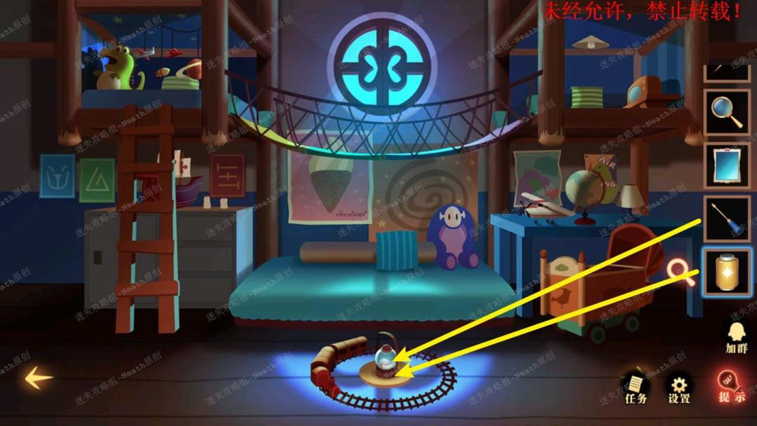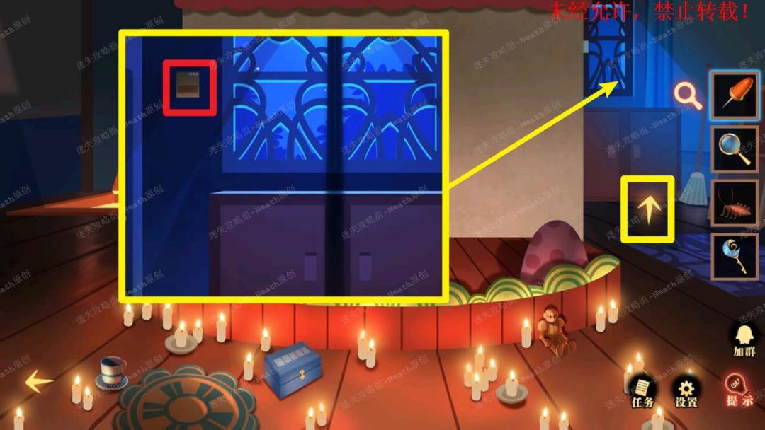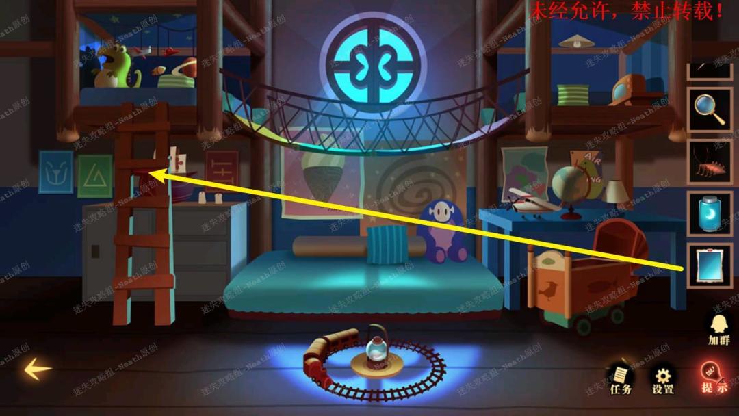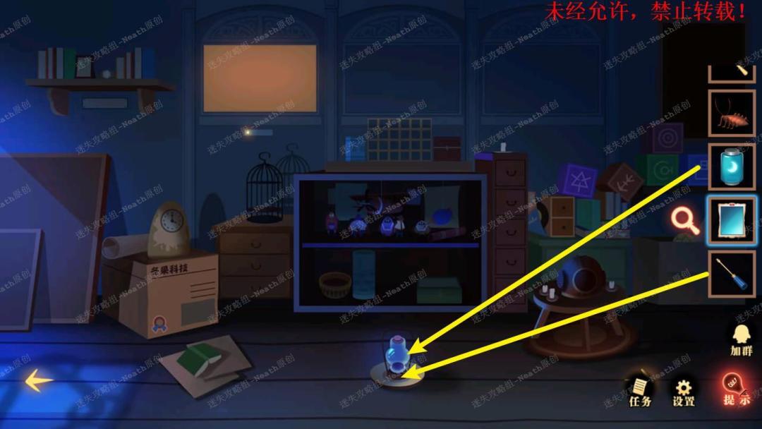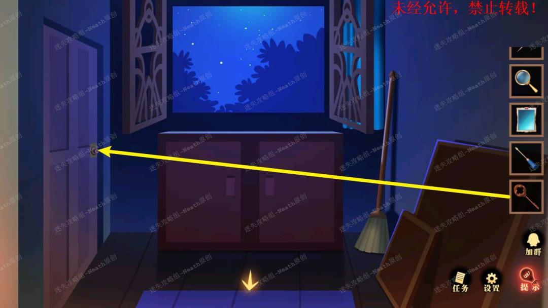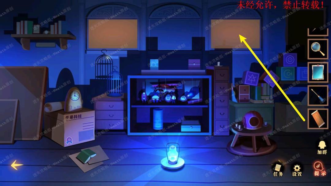 51、到杂物间,点击右边发光窗口,给树上的尺子替换成【刻度卡片】,点击发光的小门,在里面拿走【马蹄徽章】。51 51.1