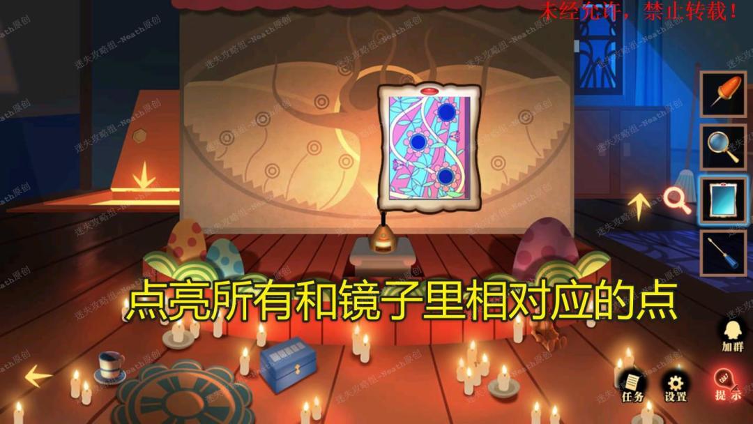 58、关闭玻璃窗,到舞台场景,对树使用【镜子】,点亮所有和镜子里相对应的点,最后在小门里拿到【古旧钥匙】。58 58.1