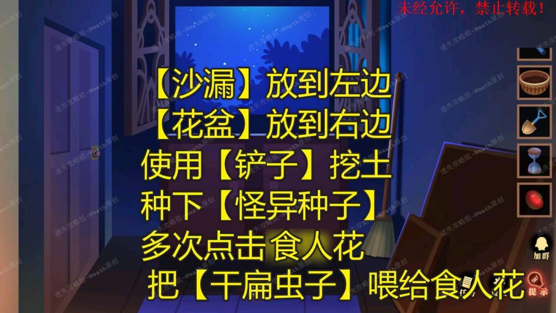 46、到储物室,打开窗户,【沙漏】放到左边,【花盆】放到右边,使用【铲子】挖土,种下【怪异种子】,多次点击沙漏,最后把【干扁的虫子】喂给食人花,拿走【橙色忘时花】。46