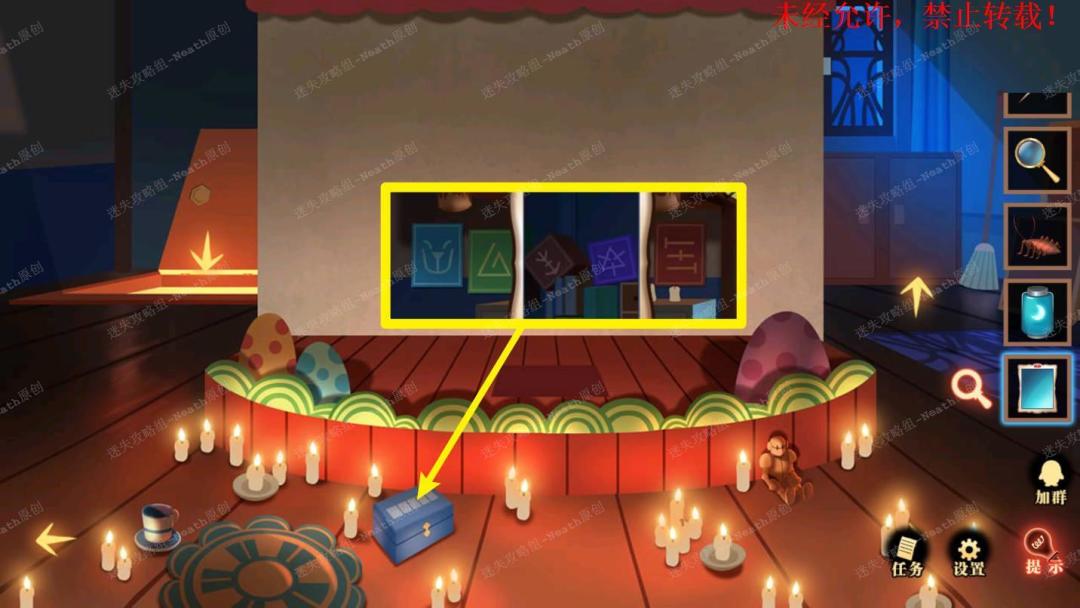 43、拿走下层的【花盆】,点击右侧盒子,进入小游戏,移动带绿色符号的方块,找到相同符号的方块(消消乐游戏),拿走【铲子】。43 43.1