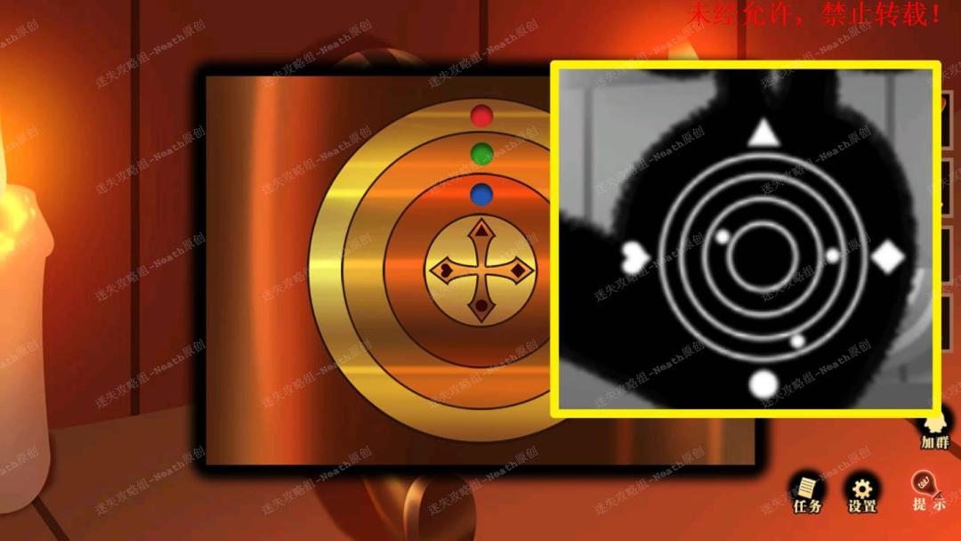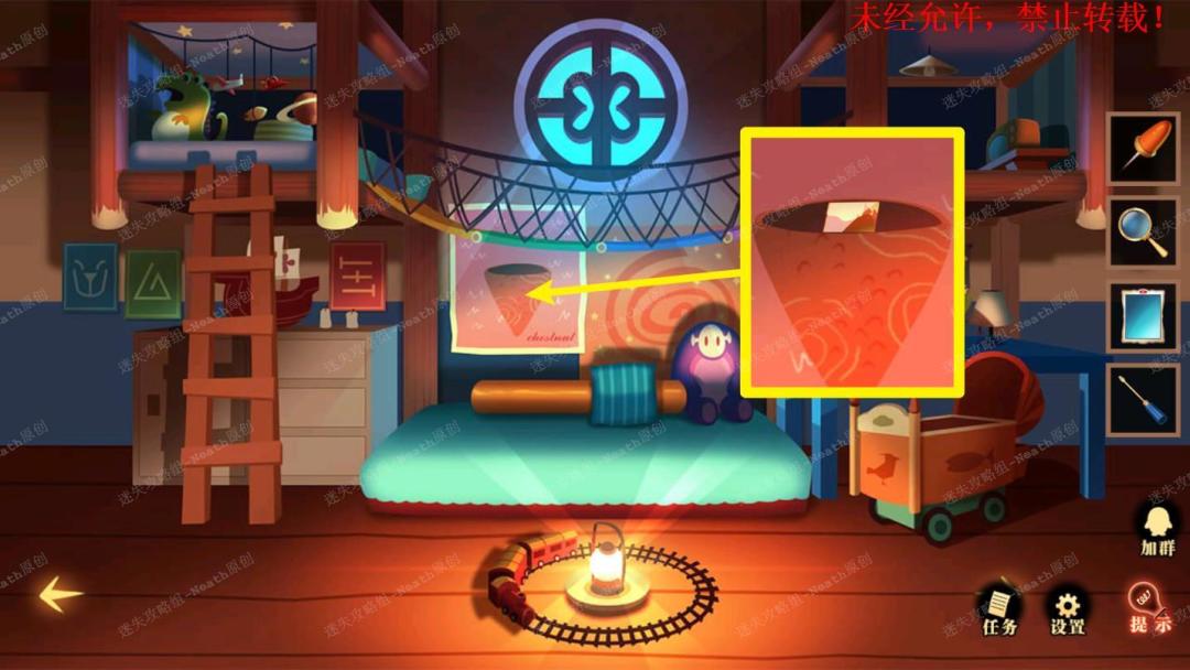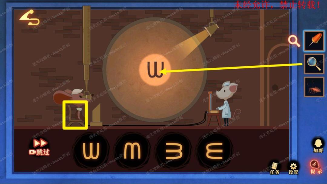 32、到杂物堆场景,点击钟表上方发光的按钮,点击发光的窗口,进入小游戏,点击椅子开始测试,根据显示的符号在下方选择正确的符号,符号变小后,使用【放大镜】查看即可,完成后拿走【月形钥匙】。32 32.1