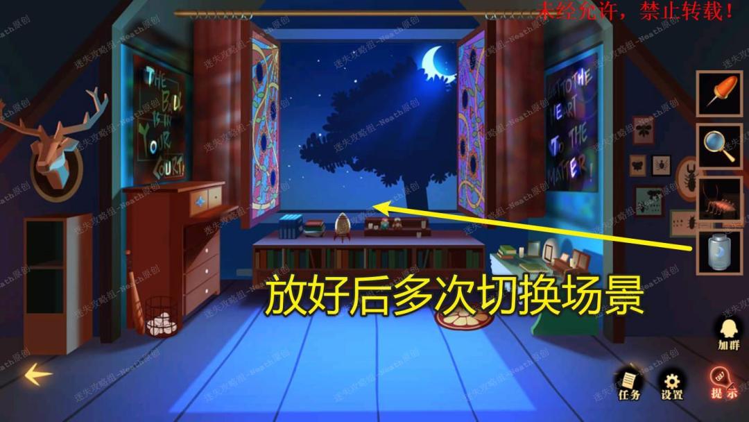 36、把【月亮瓶】放到窗台上,多次左右切换场景,拿走【发光的月亮瓶】。36