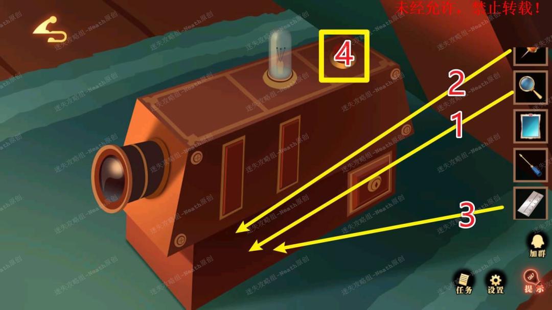 50、点击放映机,使用【放大镜】查看暗格,使用【锥子】打开,放入【尺子】,按下红色按钮,打开暗格拿走【刻度卡片】。50