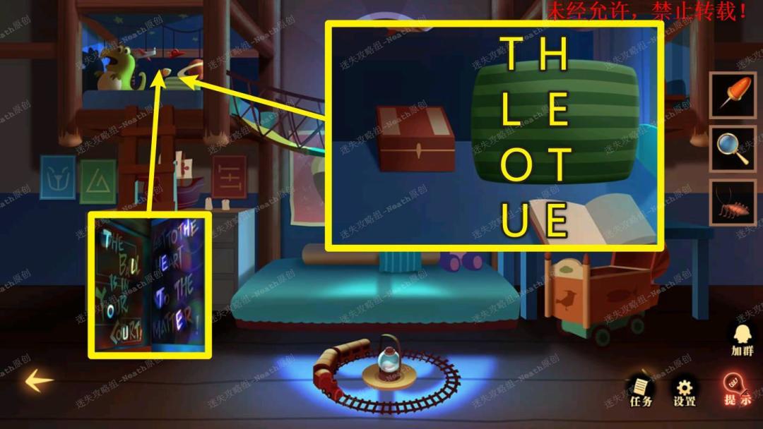 35、到初始场景,点击左上角,移开枕头,在盒子上根据壁画上亮起的字母,分别输入TLOU、HETE,打开后拿走【月亮瓶】。35