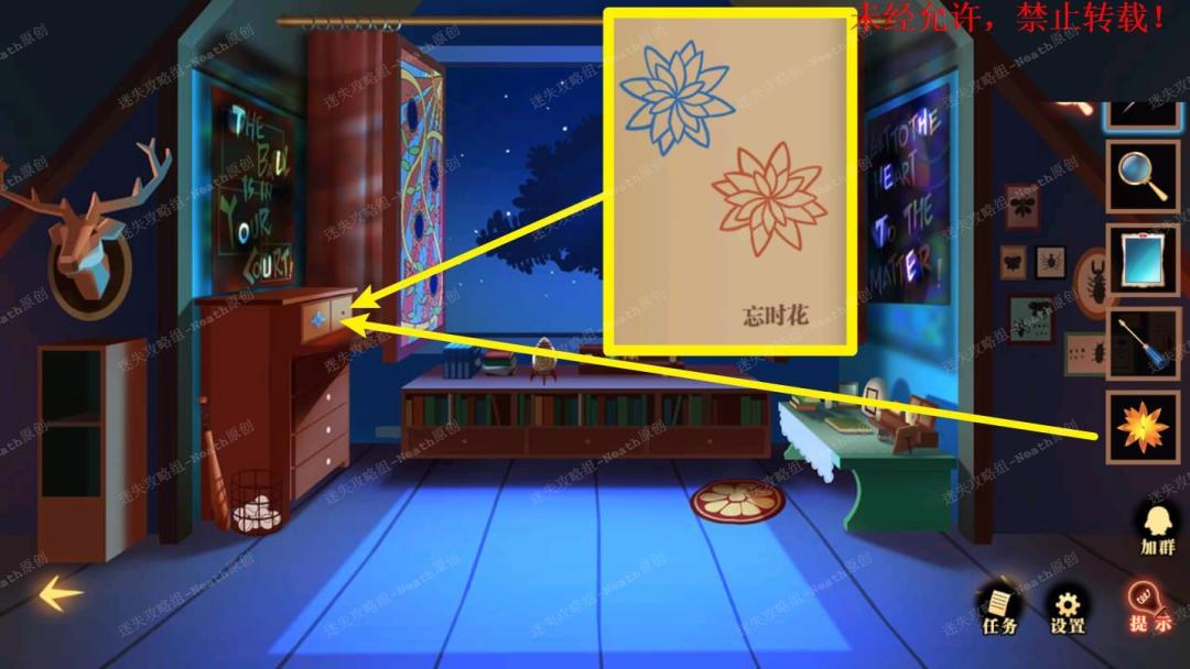 48、上楼把【橙色忘时花】放到抽屉右侧,根据线索调整花朵朝向,拿走【微型拼图】。48