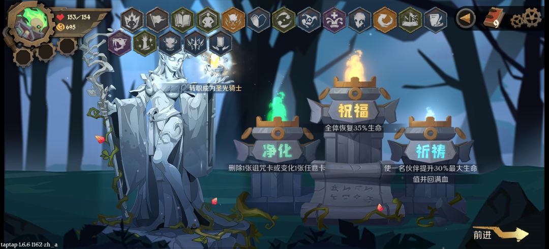 圣光骑士,对异教徒伤害增加25%,对敌人造成圣痕时恢复1点生命。至少两个祭坛连续选择祝福,下一个祭坛就会触发圣光骑士转职。(图5)